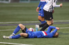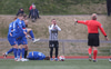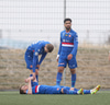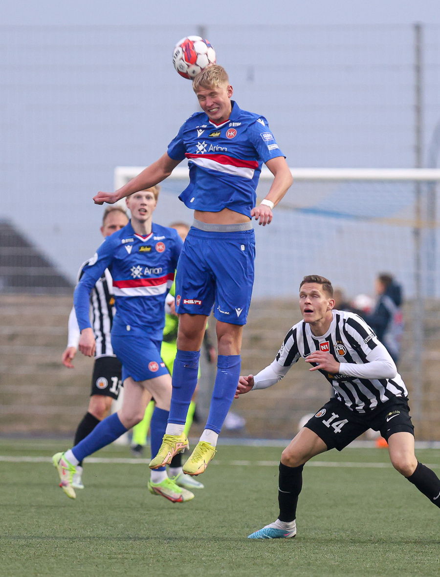 Örvar nær ekki í háan bolta og liggur eftir. Grunar að þetta sé tognun.