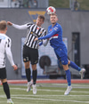 Atli Þór reynir að klippa boltann í netið en er dæmdur brotlegur.