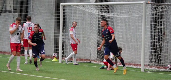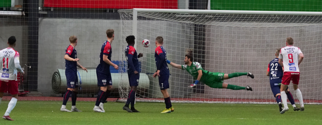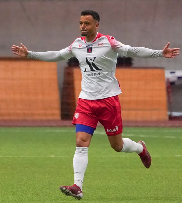 Marc Rochester Sörensen skorar fyrsta mark leiksins, það var beint úr aukaspyrnu!