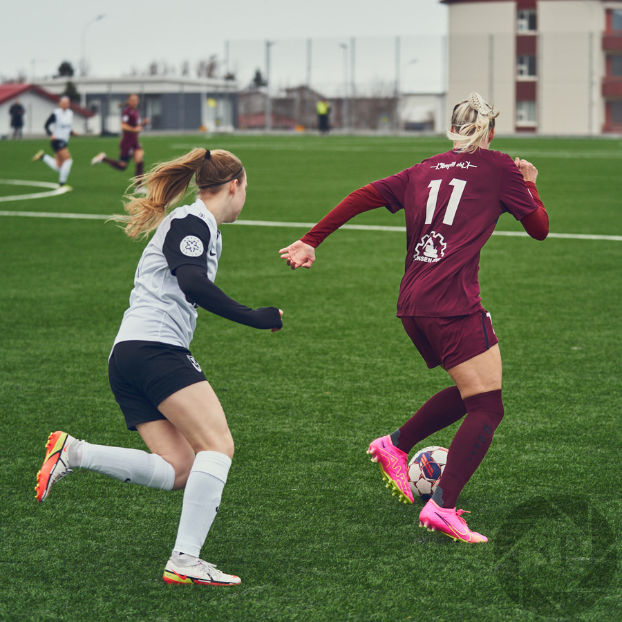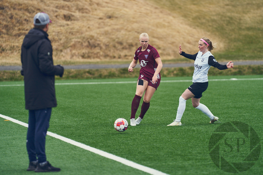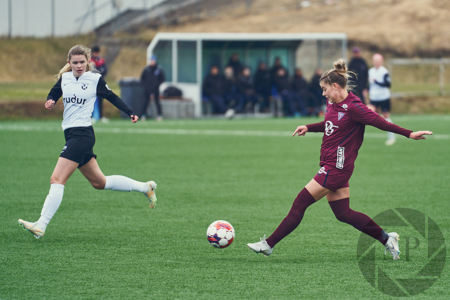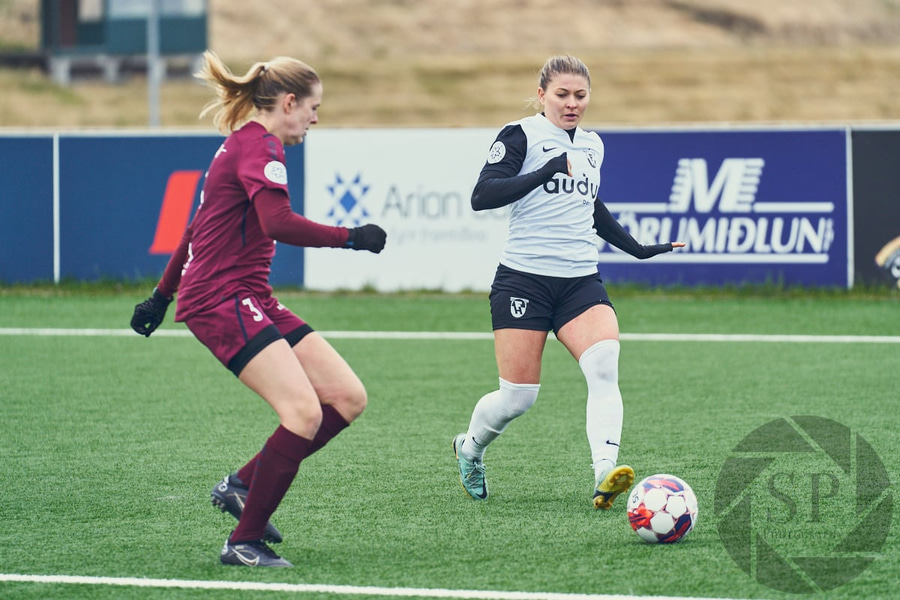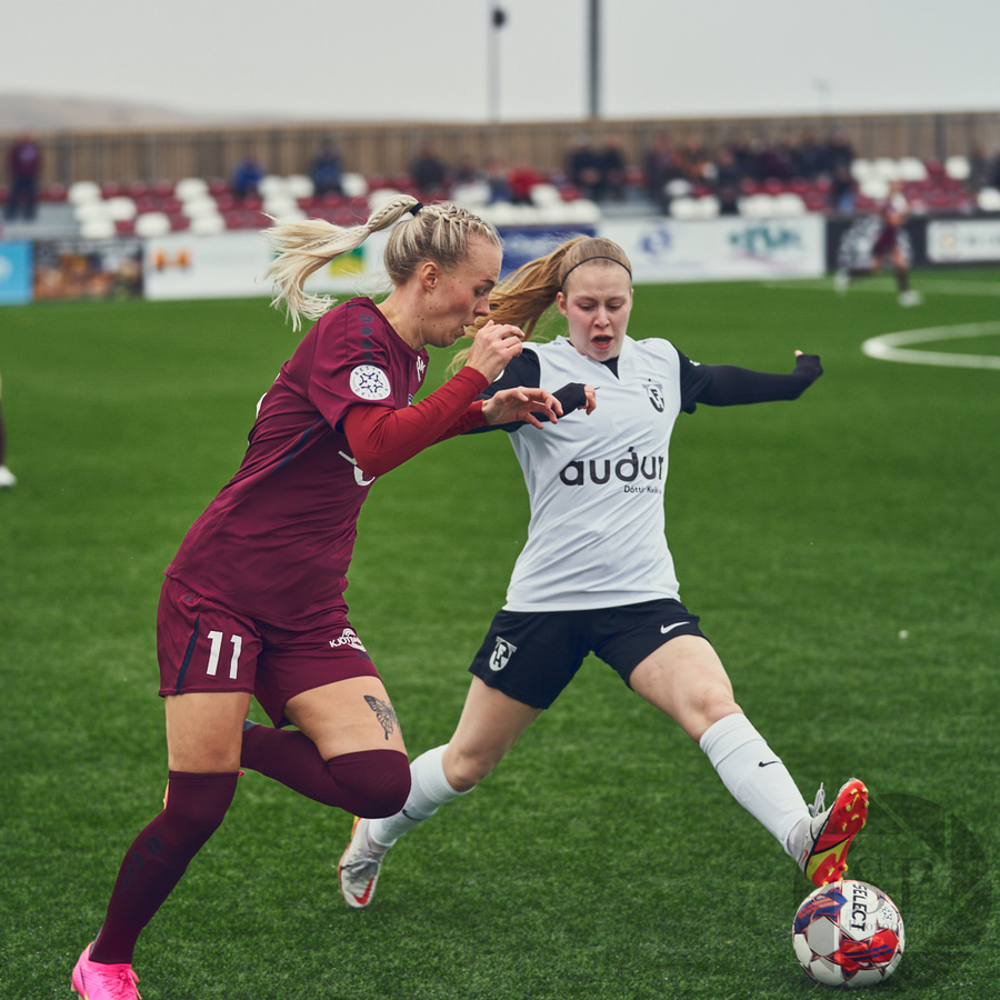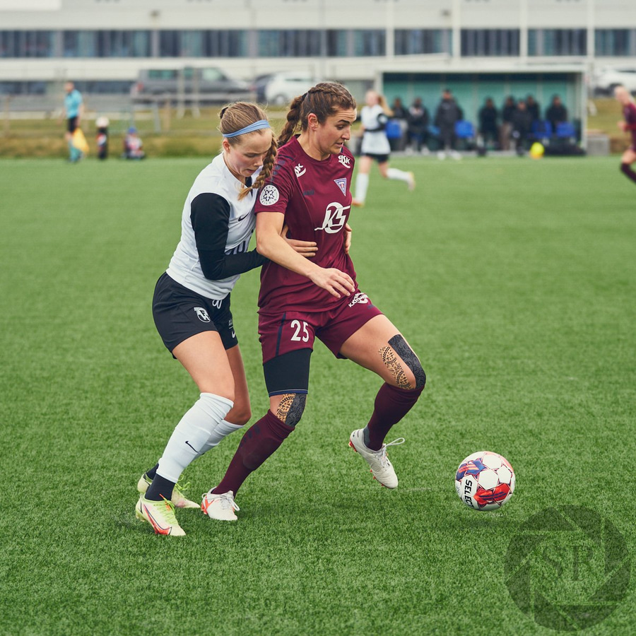 Margrét Brynja finnur Hildigunni hægra megin í teignum en Laufey verst vel og stöðvar fyrirgjöfina.