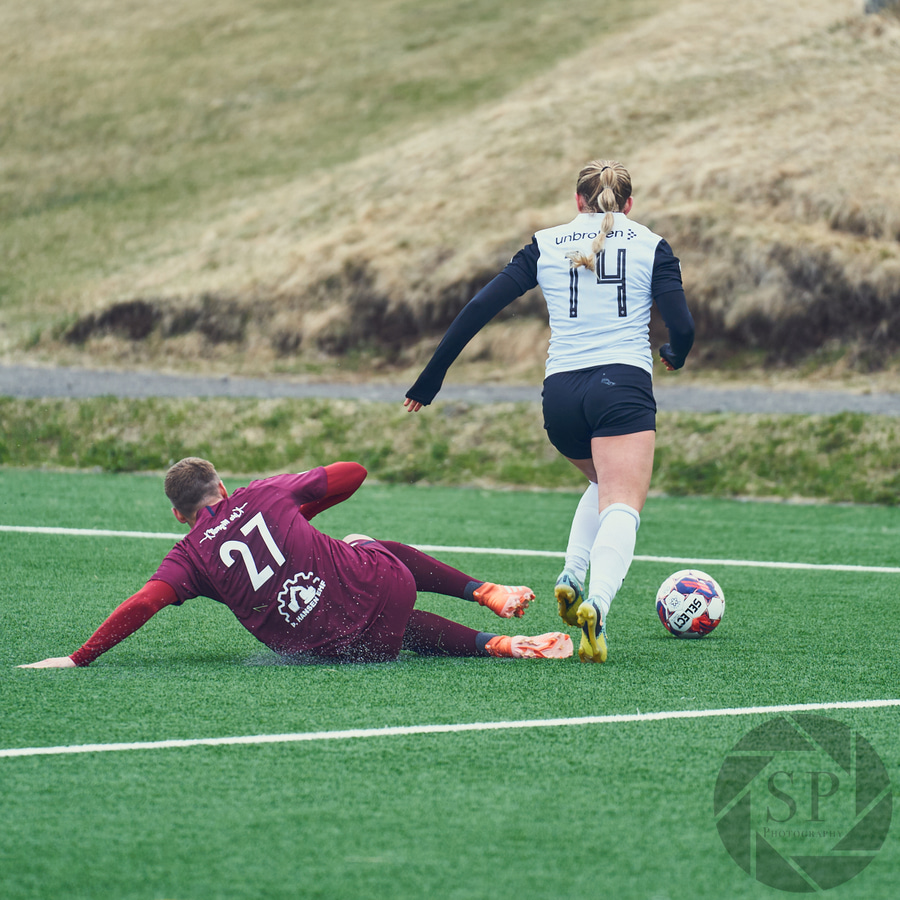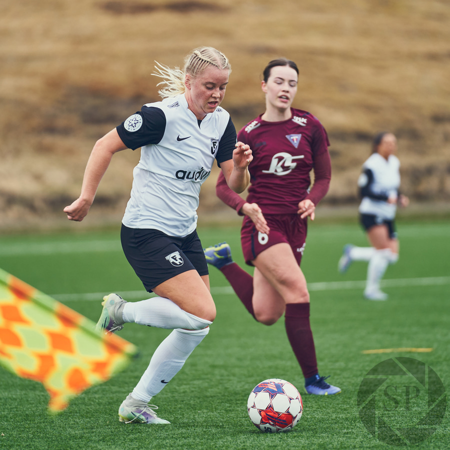 Margrét Brynja með frábæran sprett úti hægra megin, kemst inn á teiginn, finnur Shainu en skotið hennar er frekar lélegt og fer framhjá.