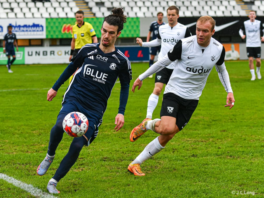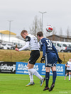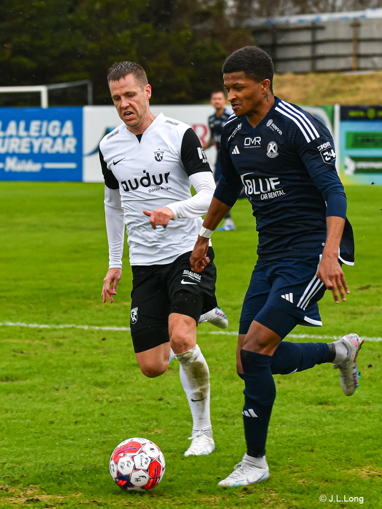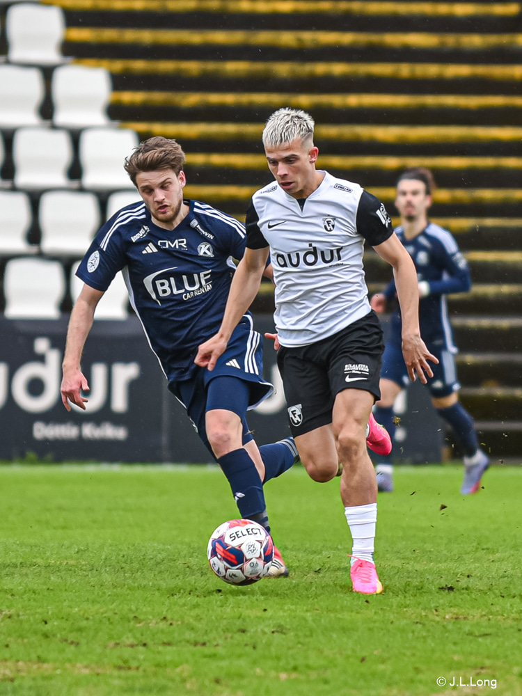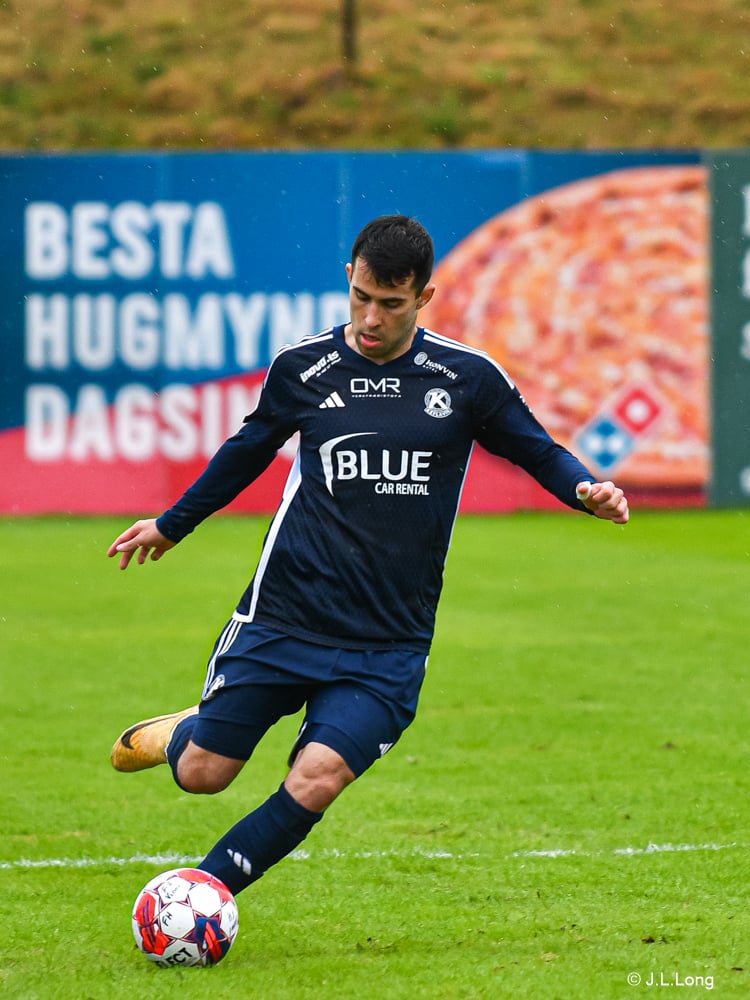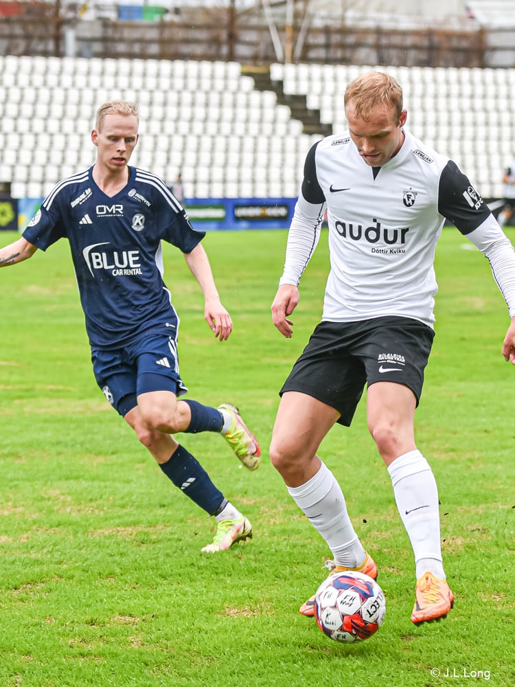Logi Hrafn vinnur boltan af Keflvíkingum og brunar af stað og mundar skotfótinn. Skotið hans fer af varnarmanni og ratar til Kjartans sem á svo líka skoti í varnarmann.