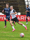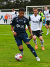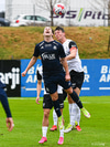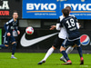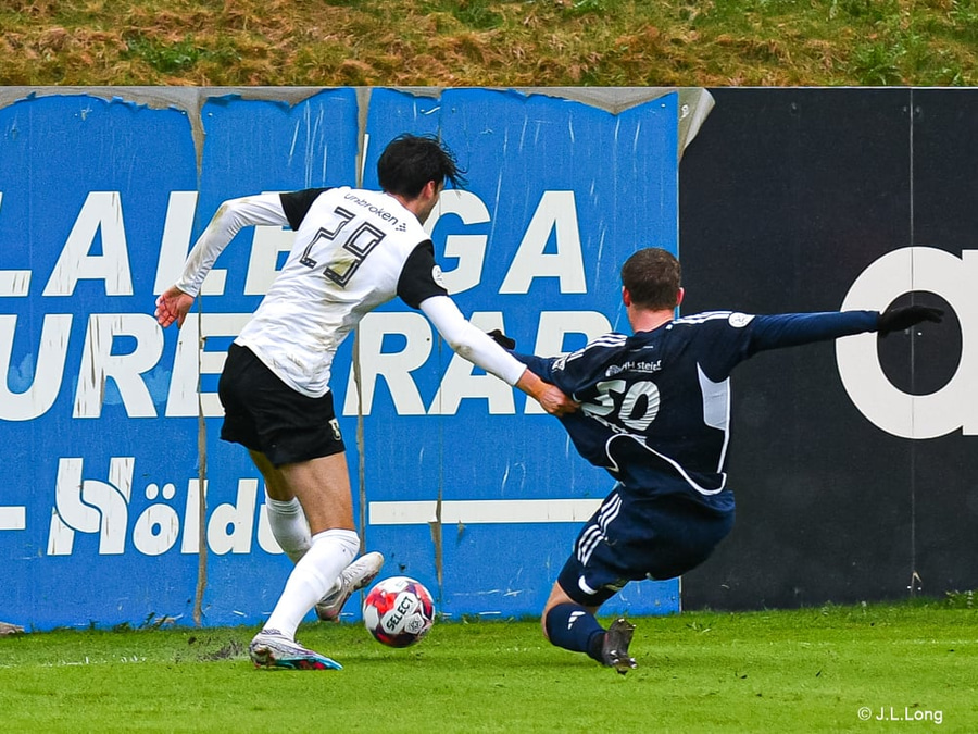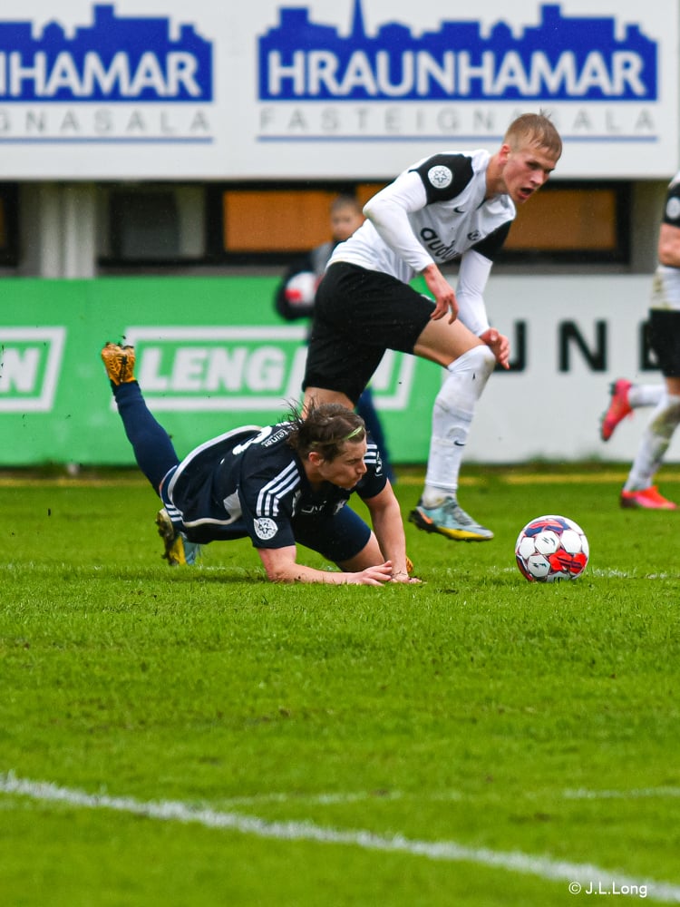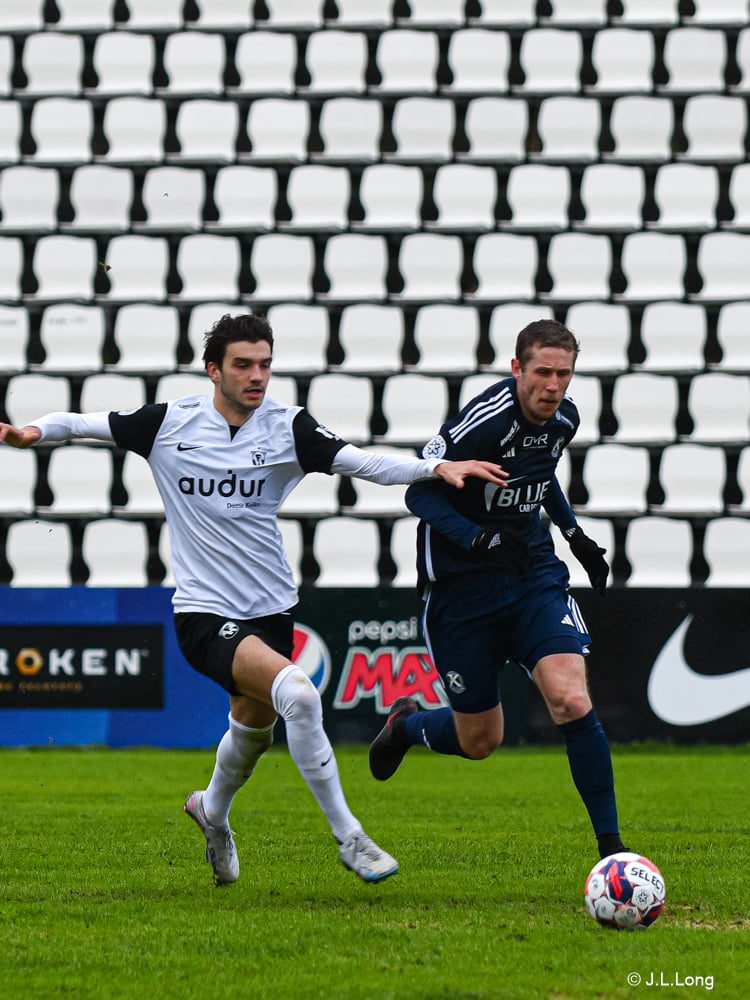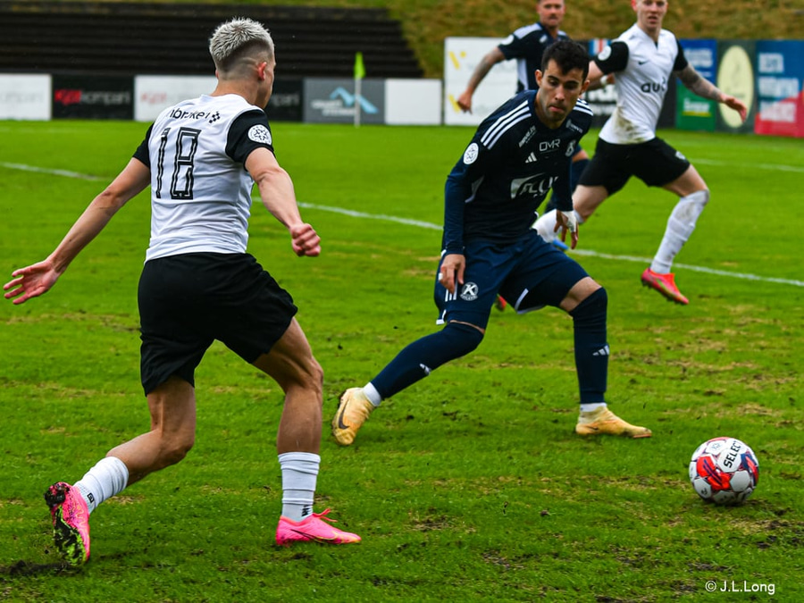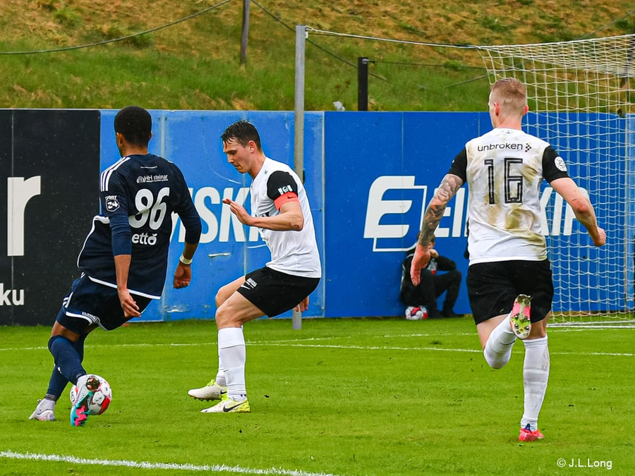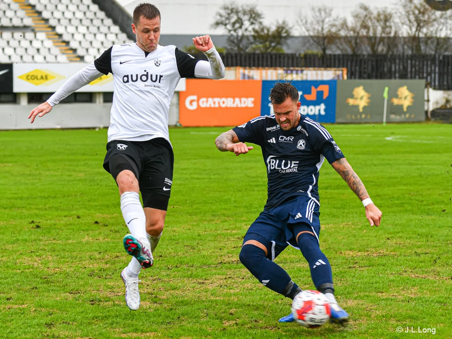 Logi Hrafn vinnur boltan af Keflvíkingum og brunar af stað og mundar skotfótinn. Skotið hans fer af varnarmanni og ratar til Kjartans sem á svo líka skoti í varnarmann.