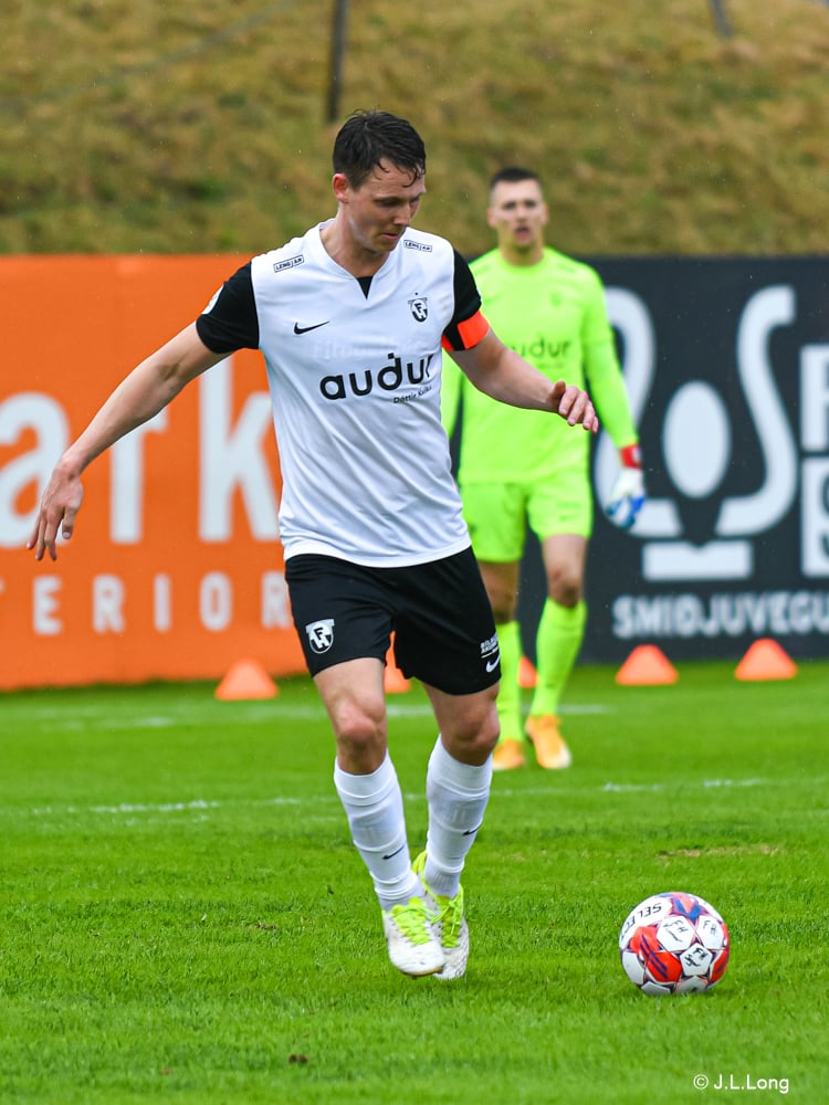 Edon Osmani ætlar að senda boltan til baka á markmann frá miðlínu en hittir engan vegin boltan þannig að þessi sending breytist í frábæra stungusendingu á Kjartan!