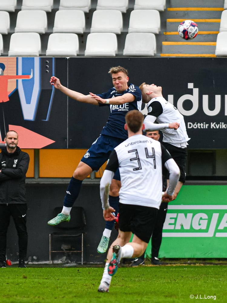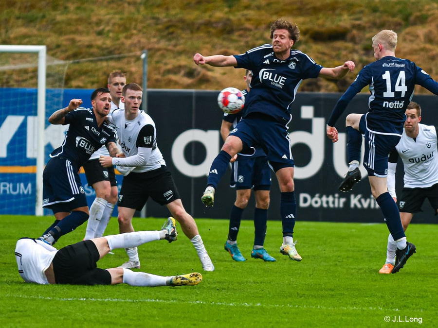 Blair gerir hinsvegar mjög vel og nær einhvervegin að setja boltan fyrir markið þannig að boltinn gæti rúllað inn en Eggert bjargar á línu