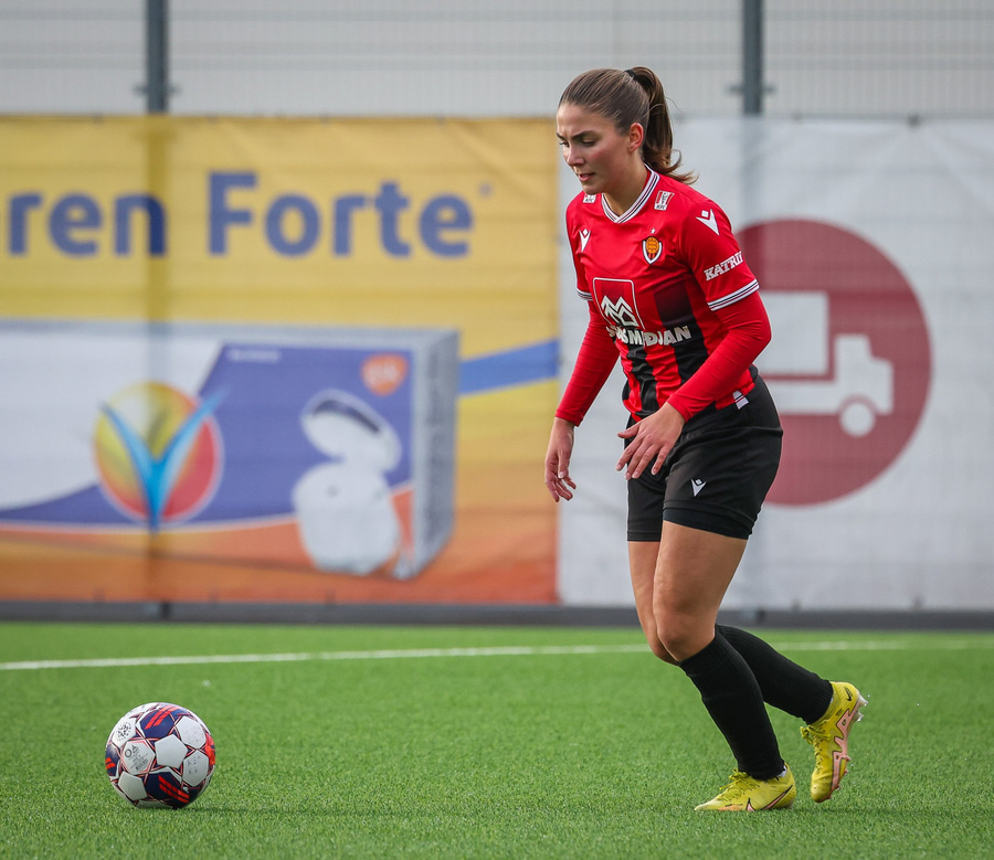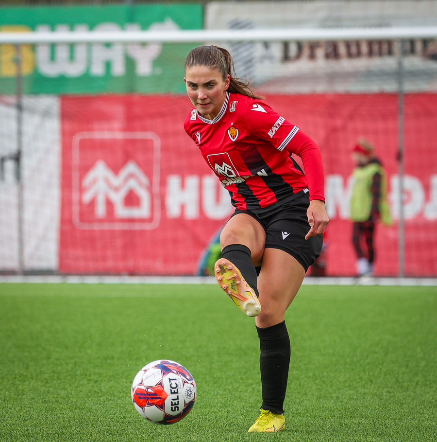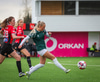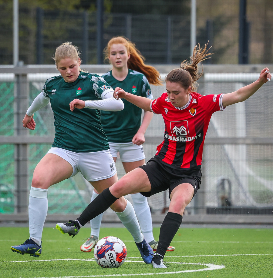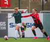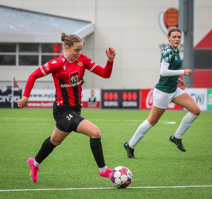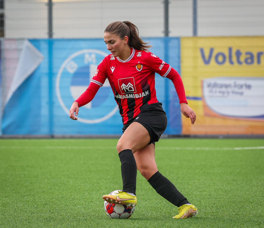 Herdís fær boltann í markinu og er lengi að losa sig við hann, Nadía vinnur boltann af henni en setur boltann framhjá. Herdís stálheppin!