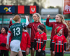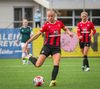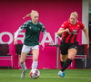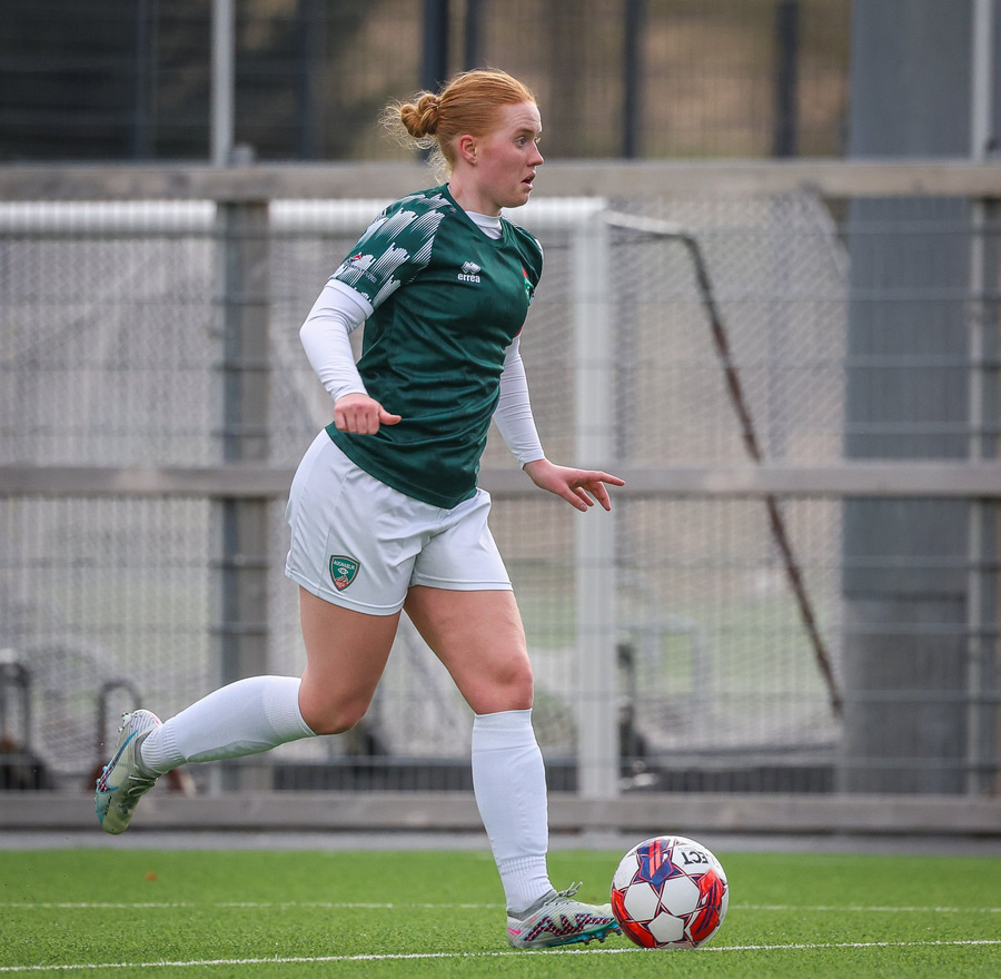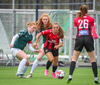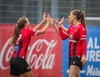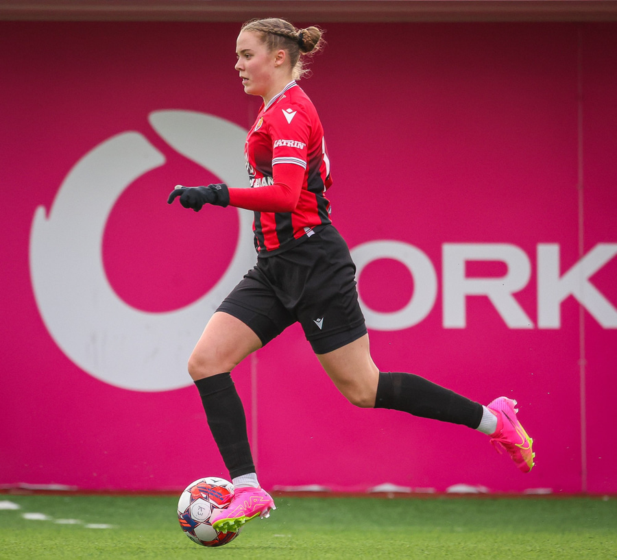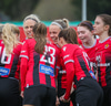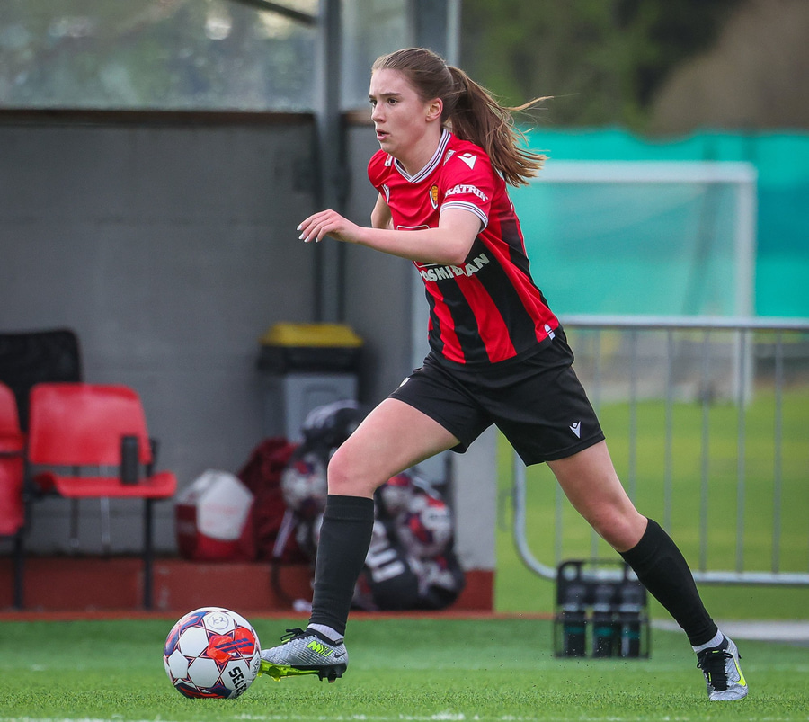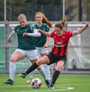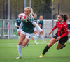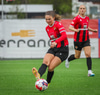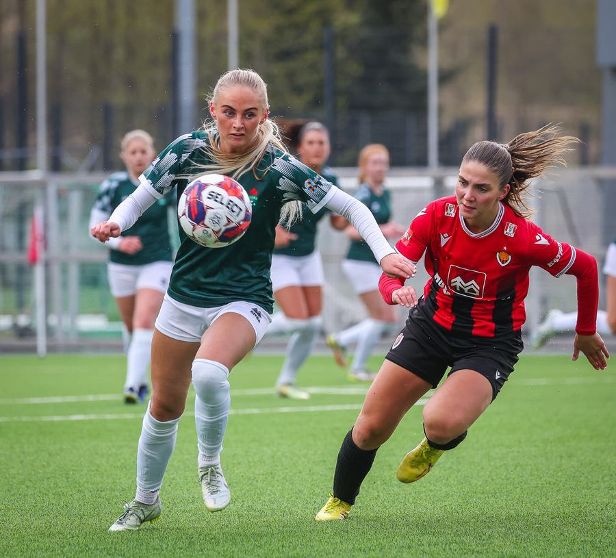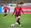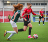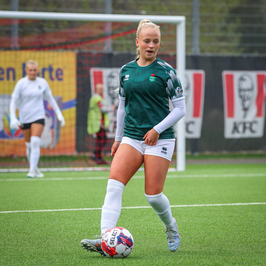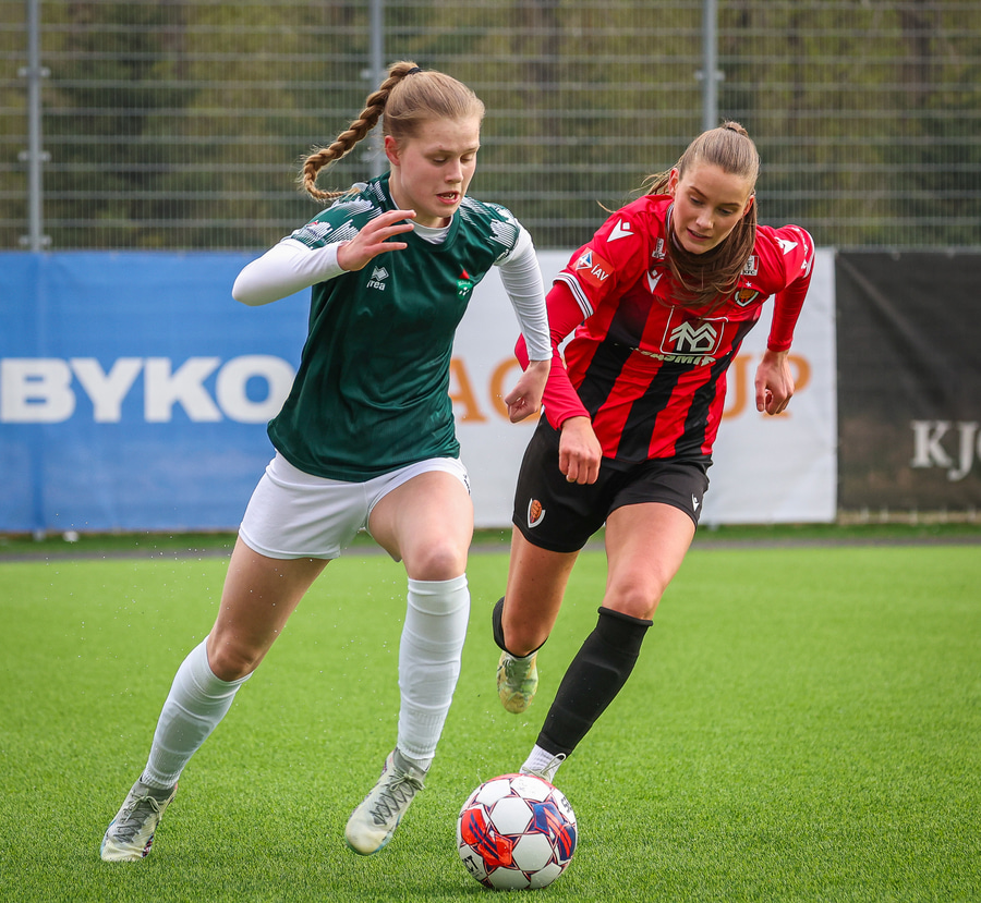 Emma vinnur boltann ofarlega á vellinum af Bryndísi G og tekur skotið sem Herdís ver meistaralega.