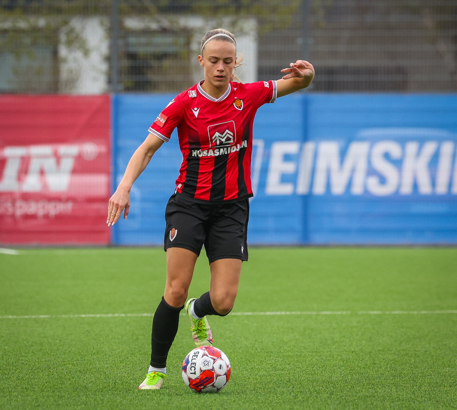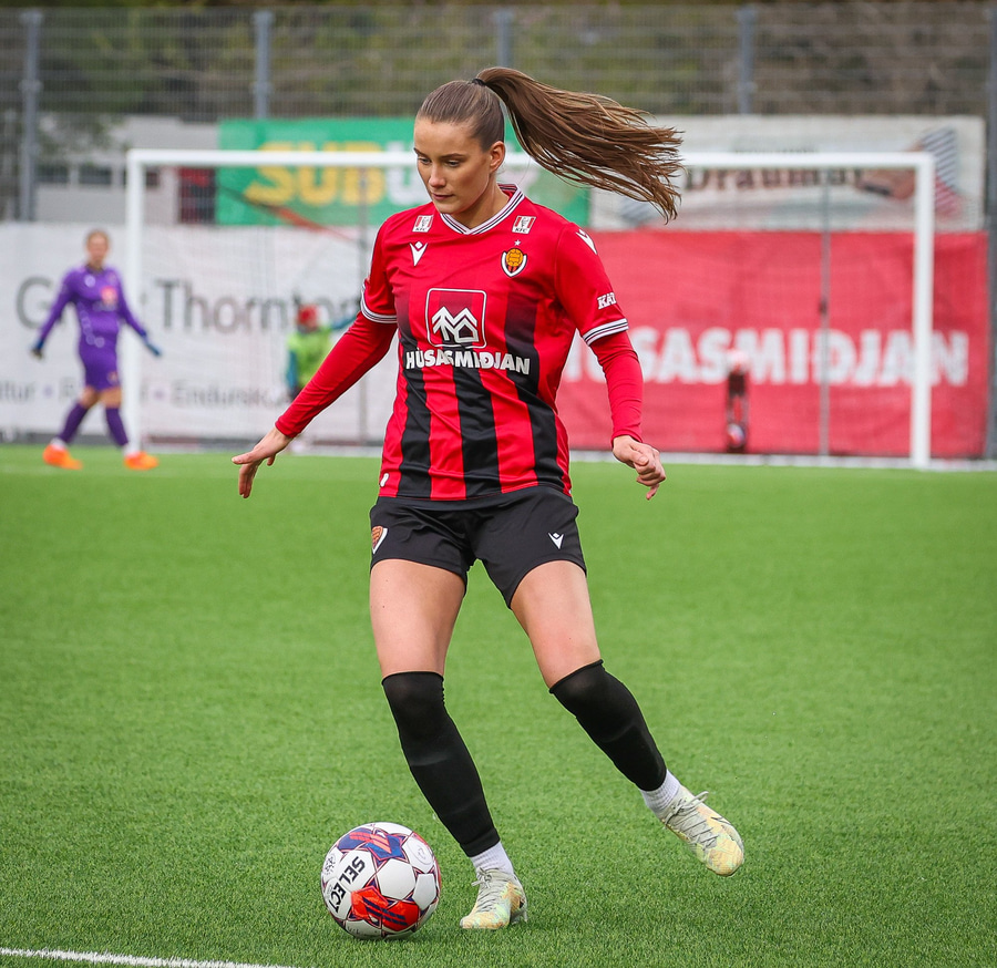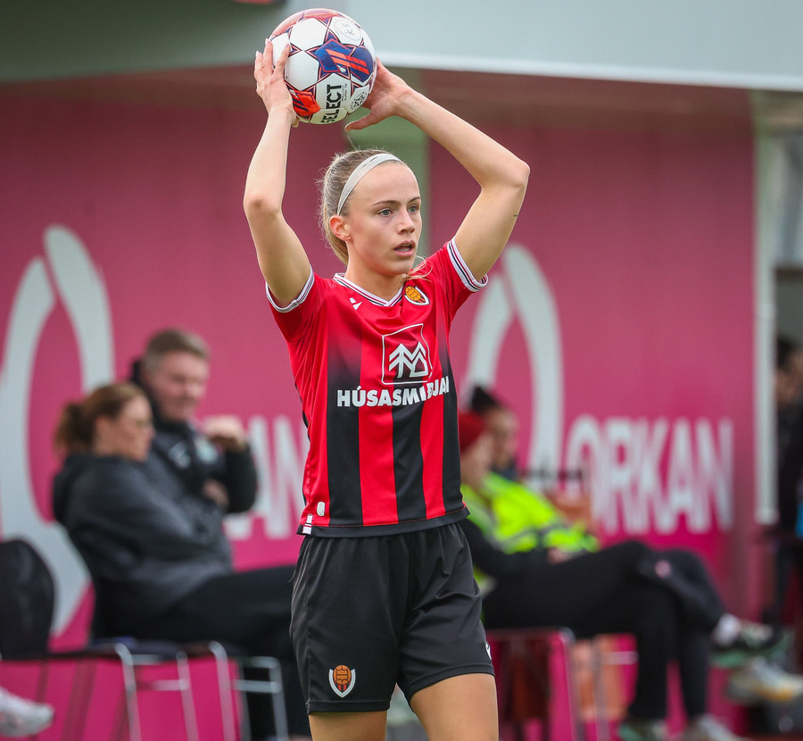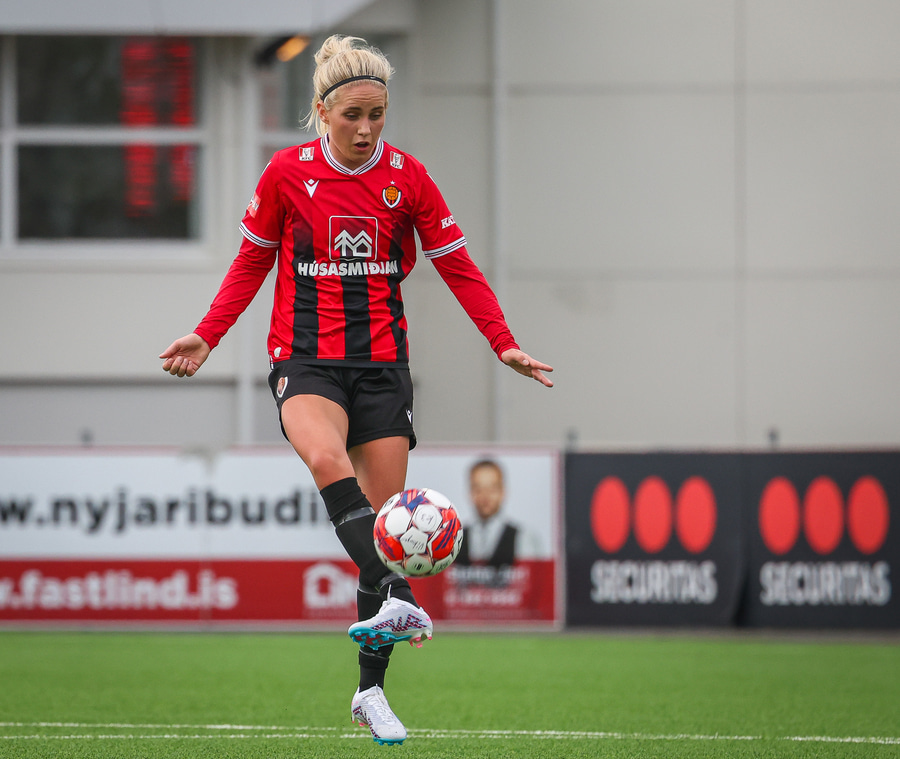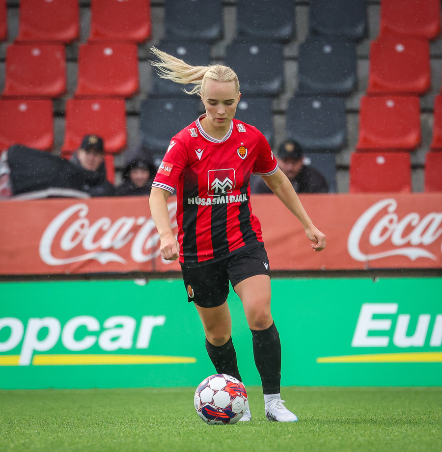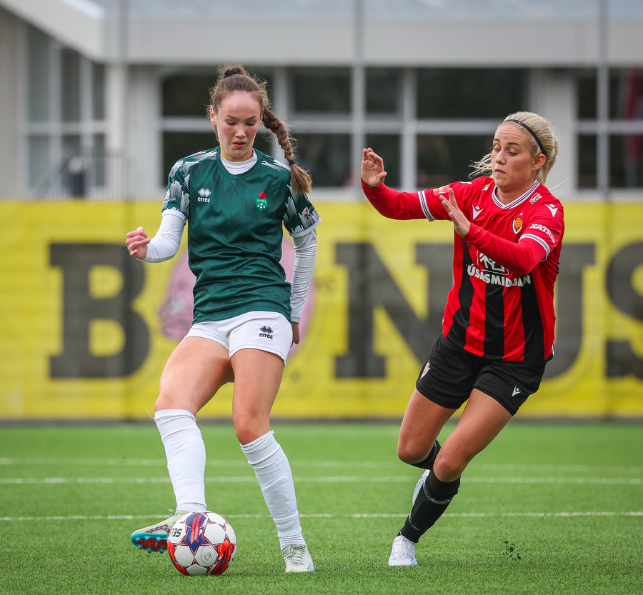 Emma með geggjaðan bolta niður kanntinn á Sigdísi sem kemur með geggjaðan bolta út í teig á Nadíu sem tekur skotið rétt fram hjá! Það munaði sáralitlu að þessi hefði farið inn!