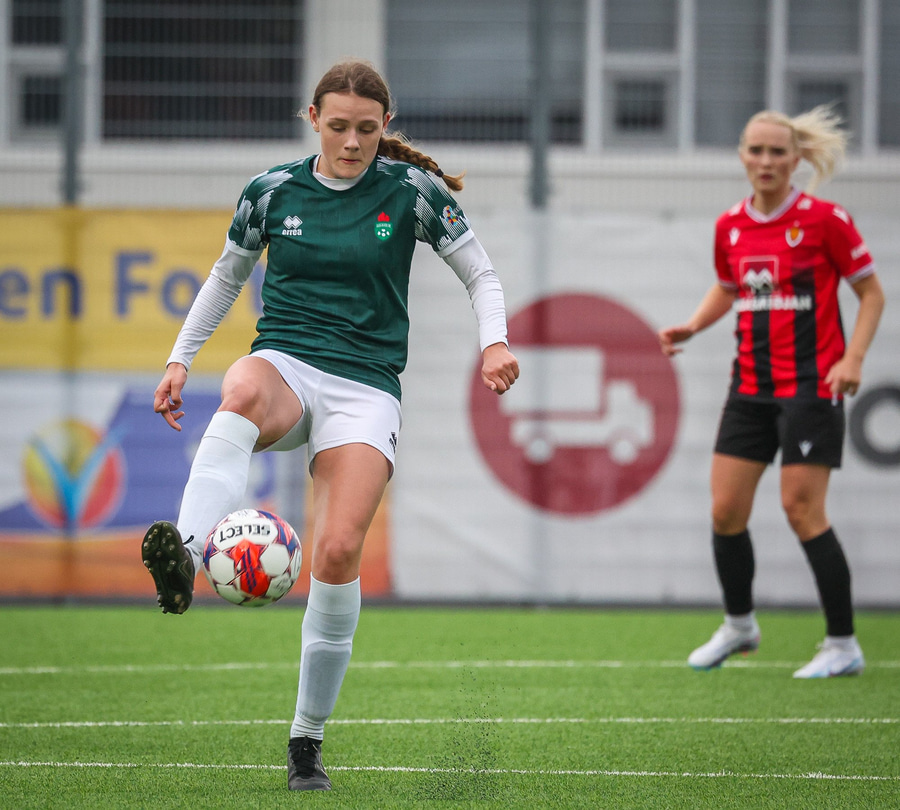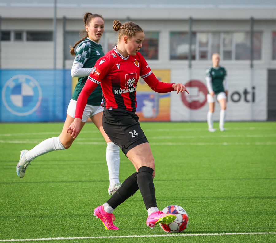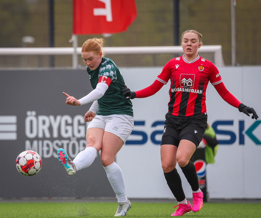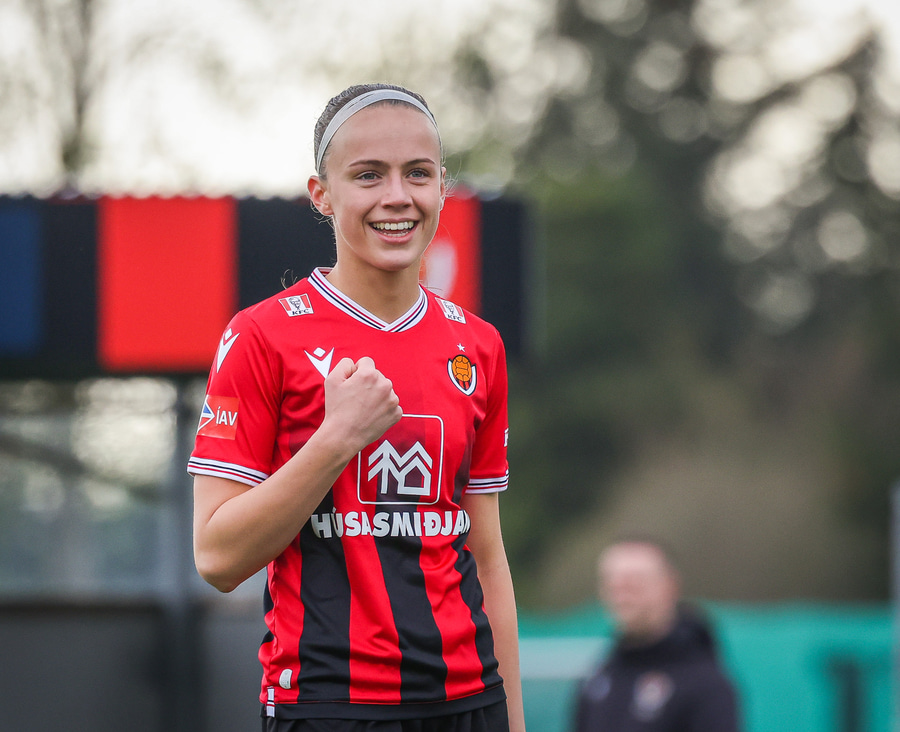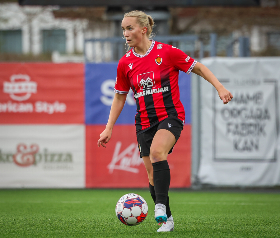 Emma með geggjaðan bolta niður kanntinn á Sigdísi sem kemur með geggjaðan bolta út í teig á Nadíu sem tekur skotið rétt fram hjá! Það munaði sáralitlu að þessi hefði farið inn!
