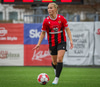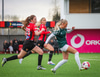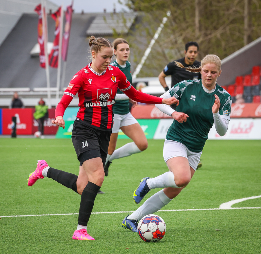 Sigdís enn og aftur að fara illa með Söru úti vinstra megin. Hún keyrir inn á teiginn og tekur skotið rétt yfir