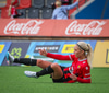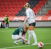 Hún er búinn að verja það mikið að reimarnar hennar losnuðu og leikurinn er stopp. Mér sýnist að Melkorka liggi líka niðri eftir eitthvað samstuð. Leikurinn er allaveganna stopp og sjúkraþjálfari Augnabliks skokkar inn á