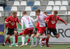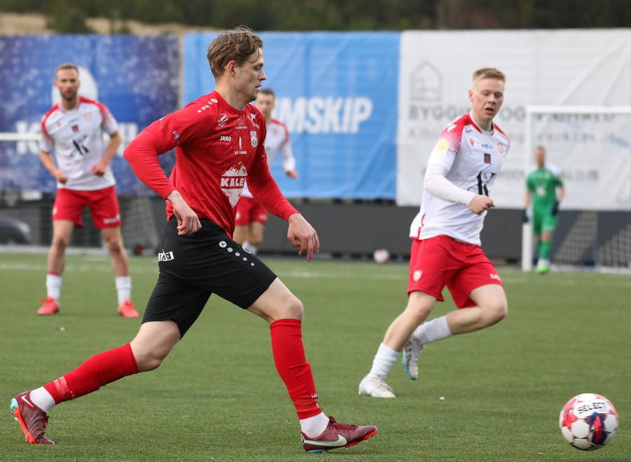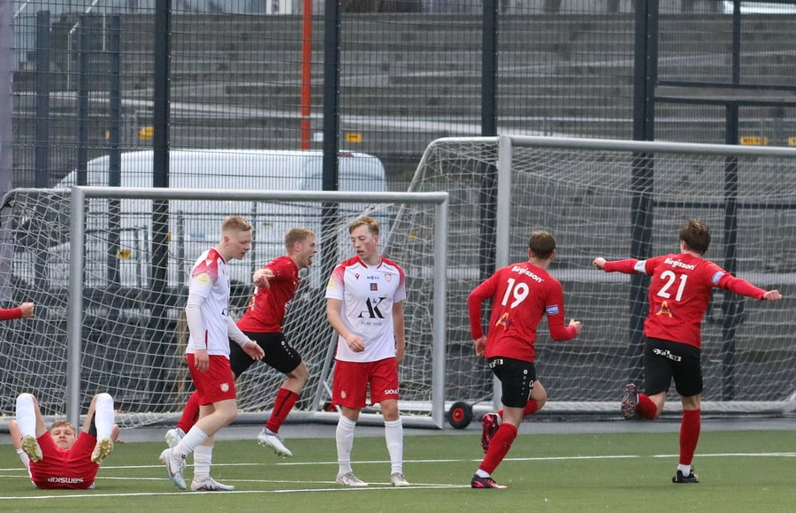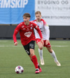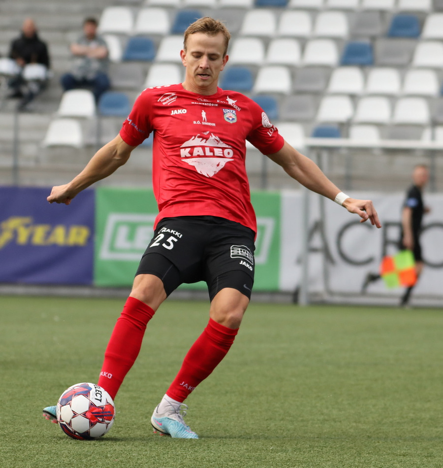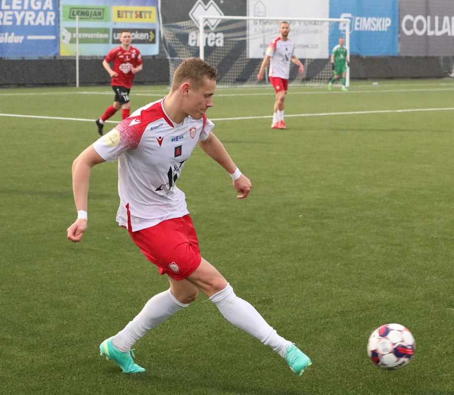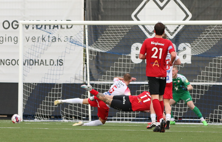 Bjarni Páll nær hér virkilega góðri fyrirgjöf sem fer beint á skallann á Arnóri Gauta sem gerir vel en boltinn fer rétt framhjá.