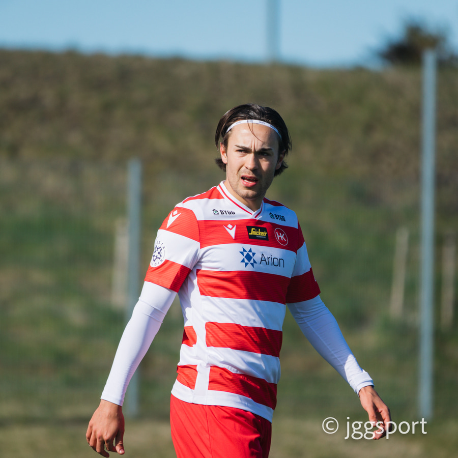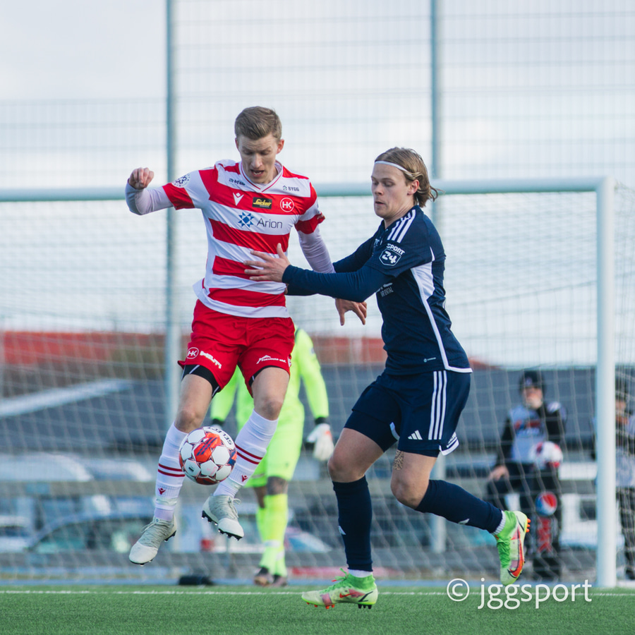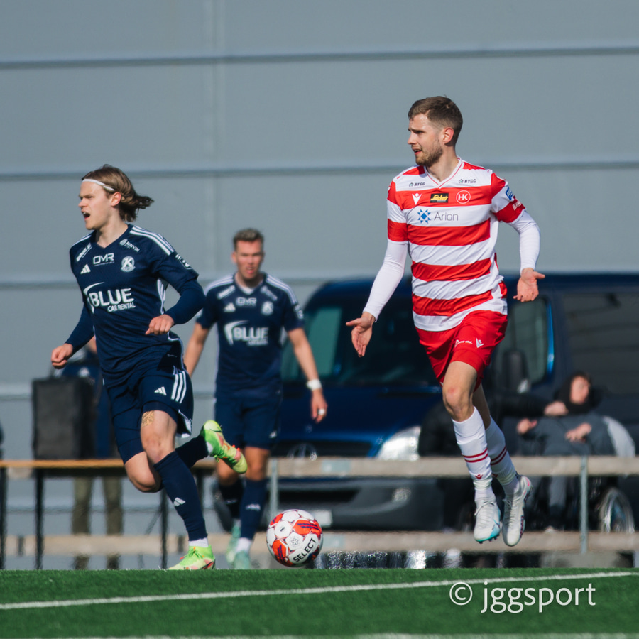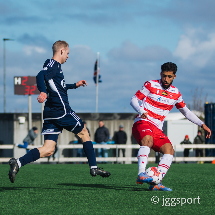 HK að fá hér fyrsta ágæta sénsinn, Örvar gerir vel hægra megin í teignum og kemst upp að endalínu. Setur boltann fyrir markið sem berst á Eyþór sem reynir skotið en boltinn í varnarmann. Frákastið aftur á Örvar en flaggið á loft.