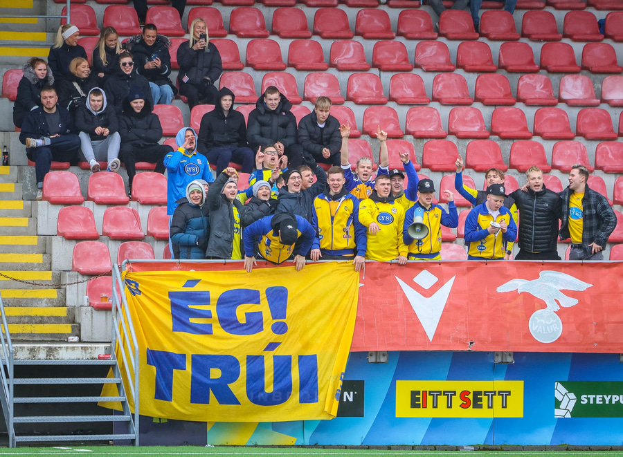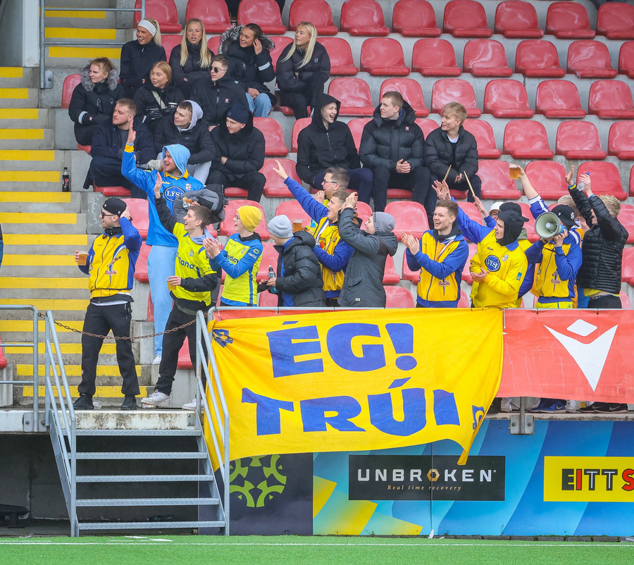 Það er greinilegt á þeim drykkjum sem nokkrir stuðningsmenn Grindavíkur eru með að Fjósið er opið. Þar verður stöðugt rennsli langt fram á kvöld.