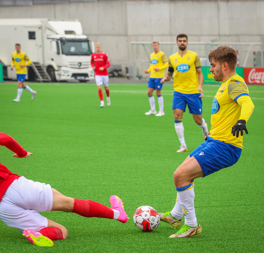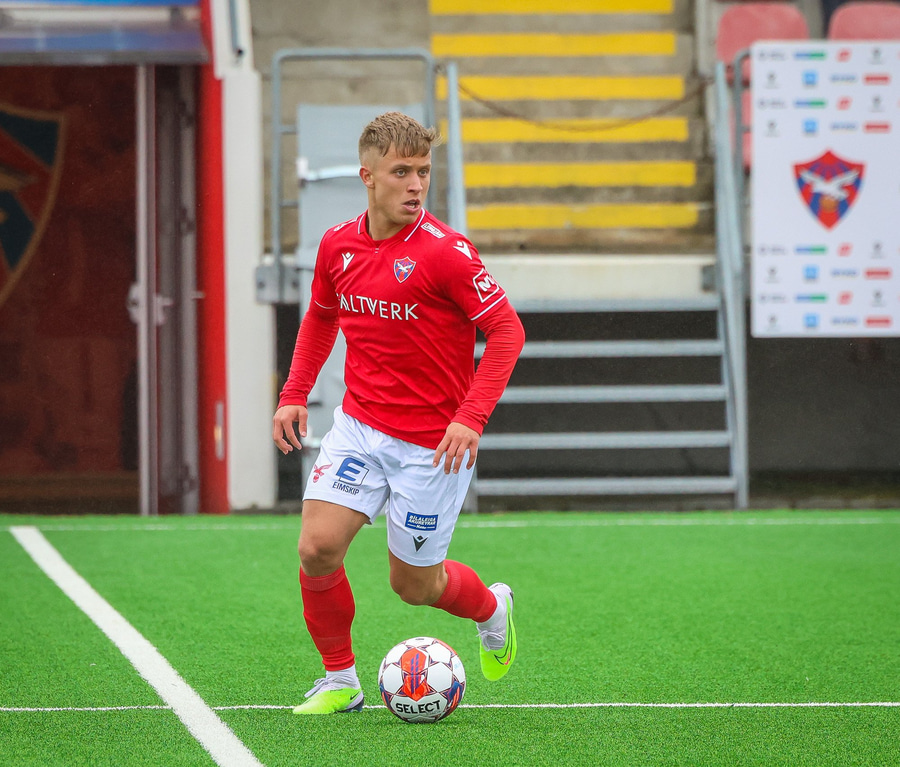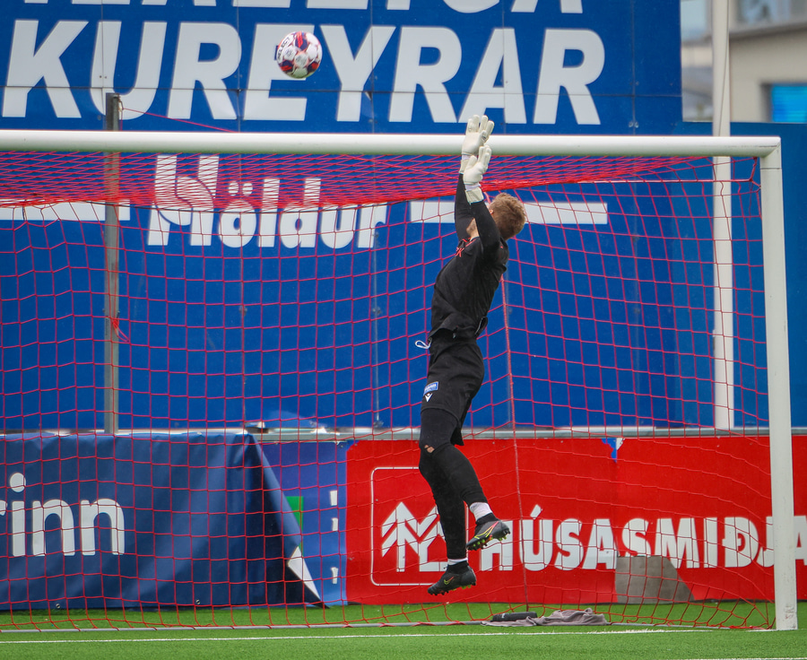Dagur Fjeldsted með fyrirgjöf sem Frederik handsamar. Grindvíkingar eru að byrja þenna leik með miklum ágætum.