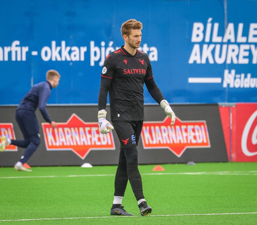 Fer framhjá einum,tekur svo skotið fyrir aftan miðju, sá að Frederik var kominn vel út úr marki sínu og lét vaða úr miðjuhringnum! Boltinn söng í netinu.