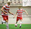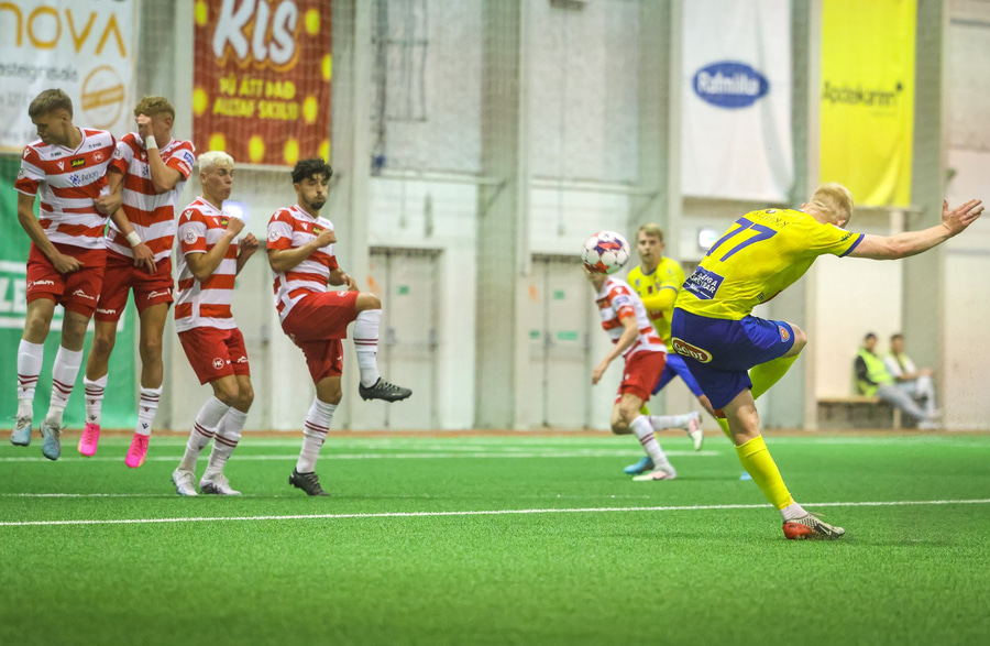 Hallgrímur tekur aukaspyrnuna sjálfur og reynir skotið. Skotið fer af afturendanum á Ívari Erni og þaðan í netið.