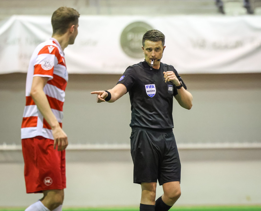 Dæmt á að Arnar hafi kýlt Dusan í fyrirgjöf en Arnar var einfaldlega á undan í boltann og fær svo Dusan í sig.