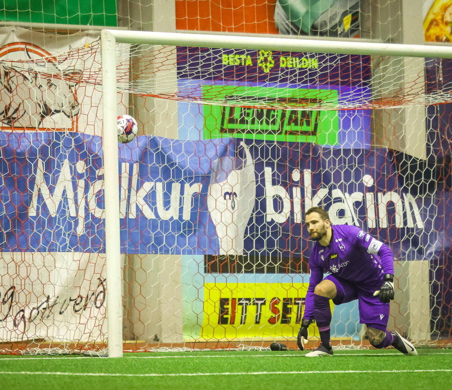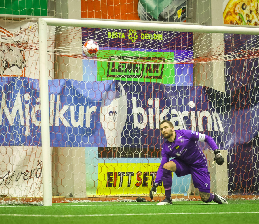 Hallgrímur ansi öruggur og neglir þessu upp í vinstra hornið. Arnar fer í hitt hornið.