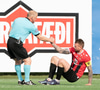 Nikolaj fékk högg á ökklann og liggur hér eftir. Stendur upp og heldur leik áfram.