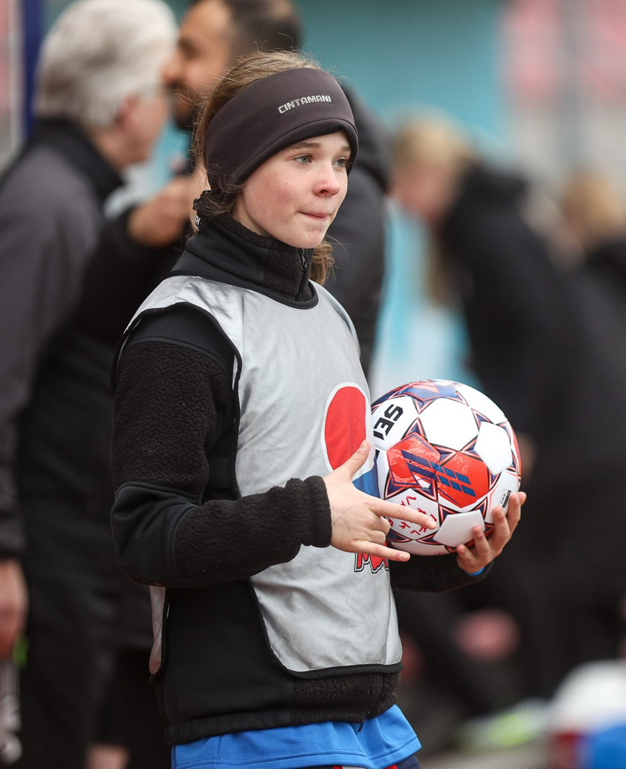 Valsarar fá horn og Tahnai hefur lítinn húmor fyrir því hvað þær ætla sér að tefja þannig hún hleypur og stillir boltanum upp fyrir þær.