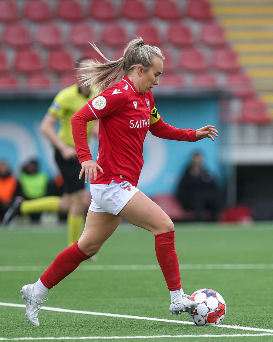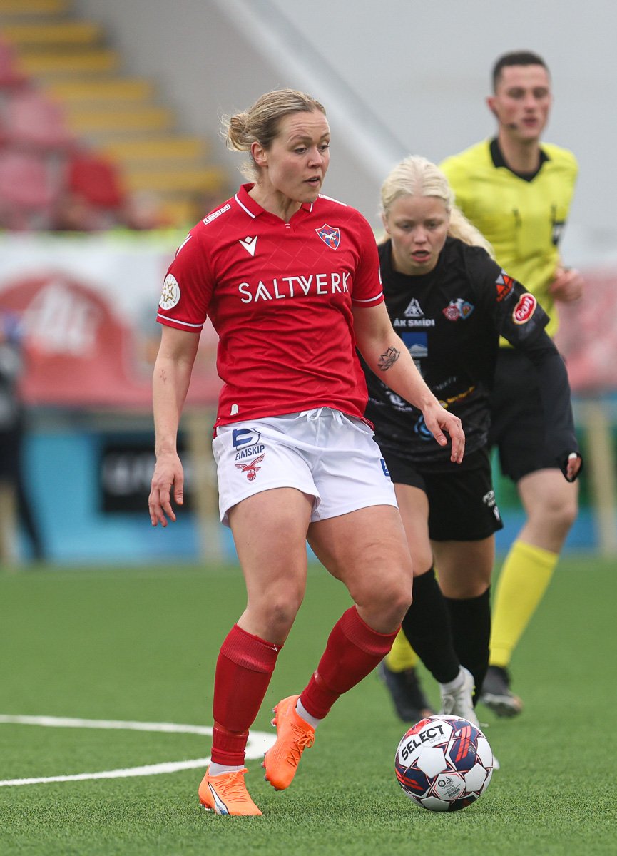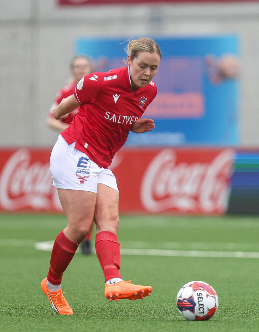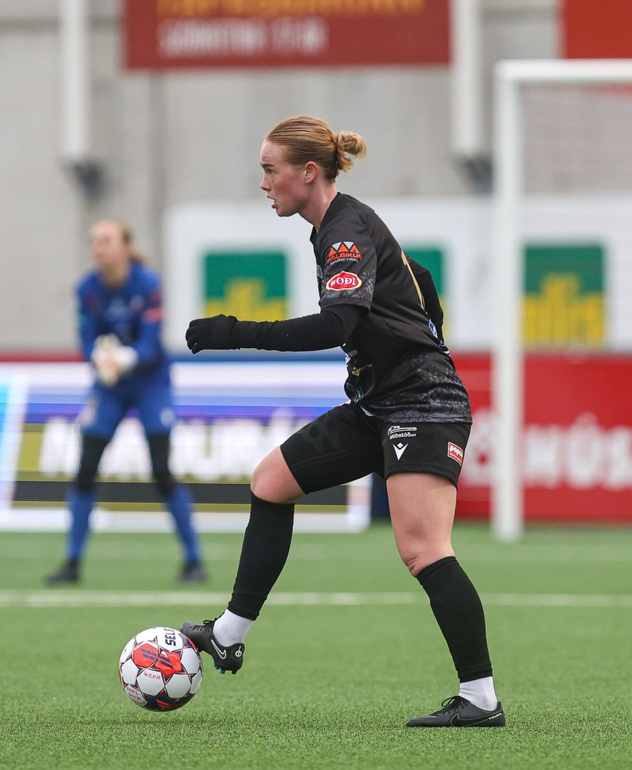 Málfríður svoleiðis straujar Kimberley eftir að hún losar boltann og er stálheppinn að sleppa við það gula