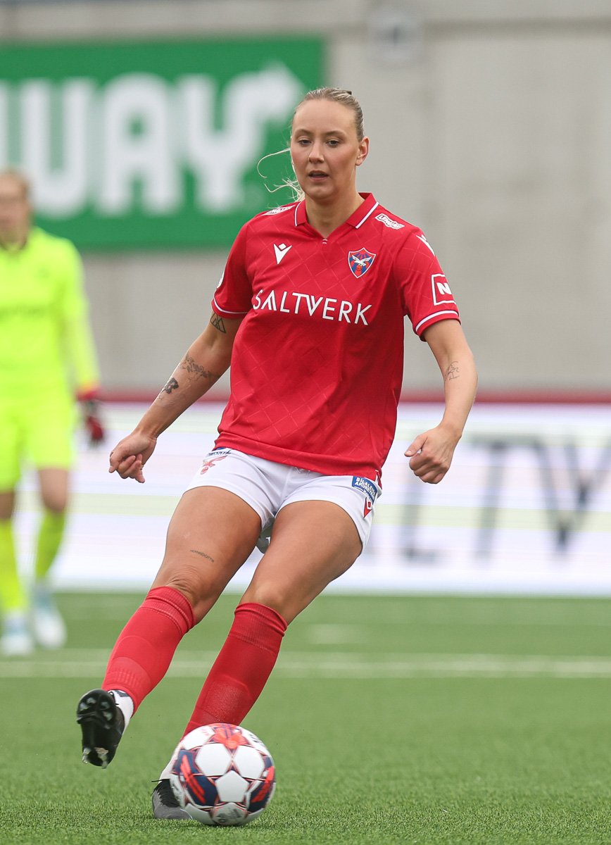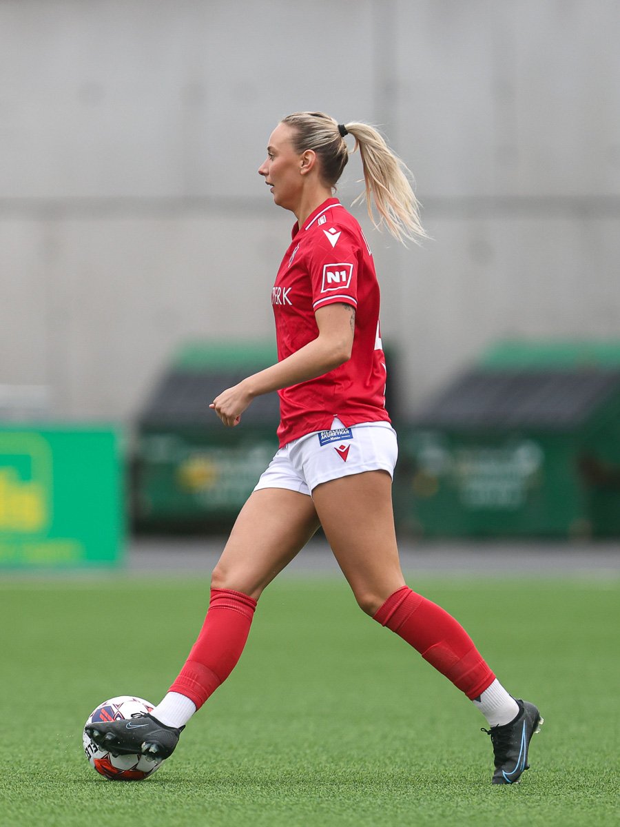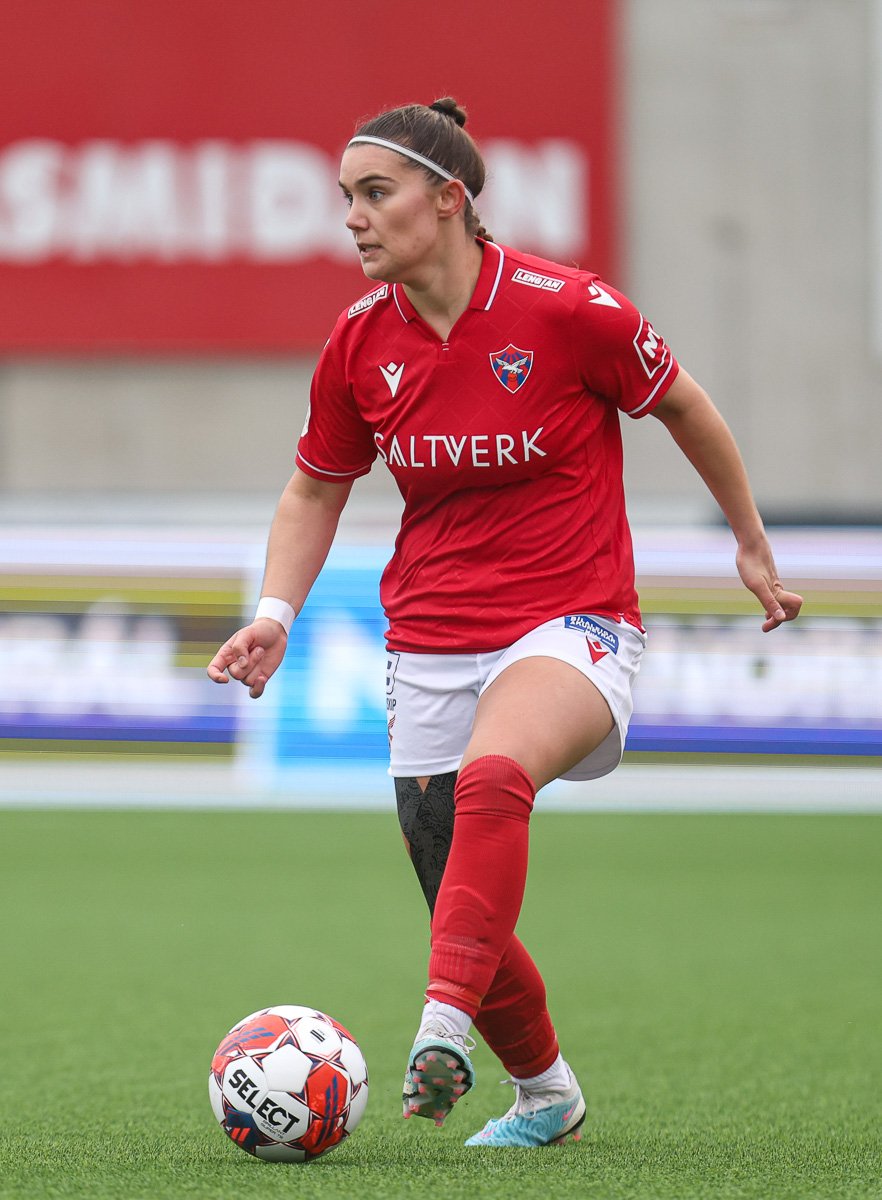 Málfríður svoleiðis straujar Kimberley eftir að hún losar boltann og er stálheppinn að sleppa við það gula