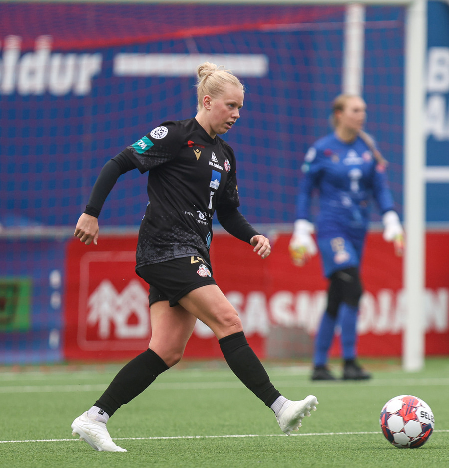 Aftur á Anna Rakel bolta inn í. BBoltinn fer beint á Huldu Björg sem tekur vindspark og hittir ekki boltann en hún hefur andað léttar þegar hún sá að Jakobína var fyrir aftan hana tilbúin til að hreinsa