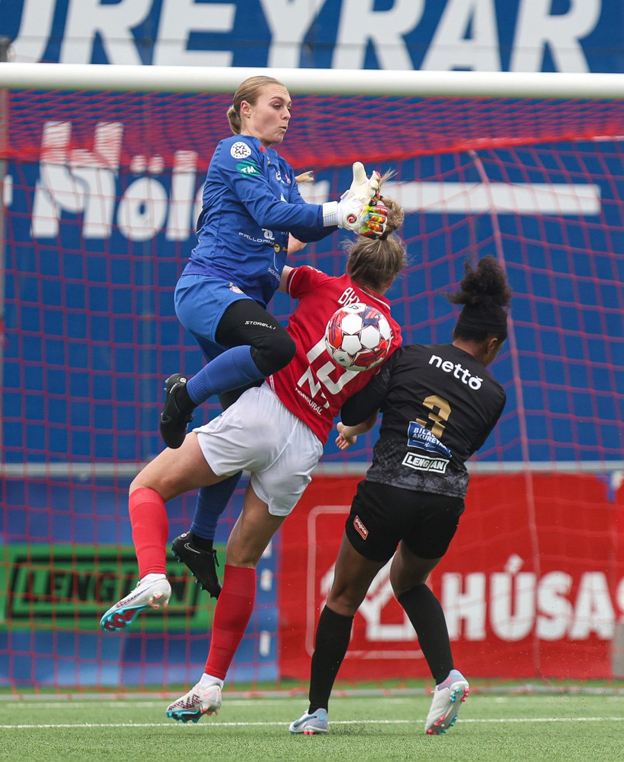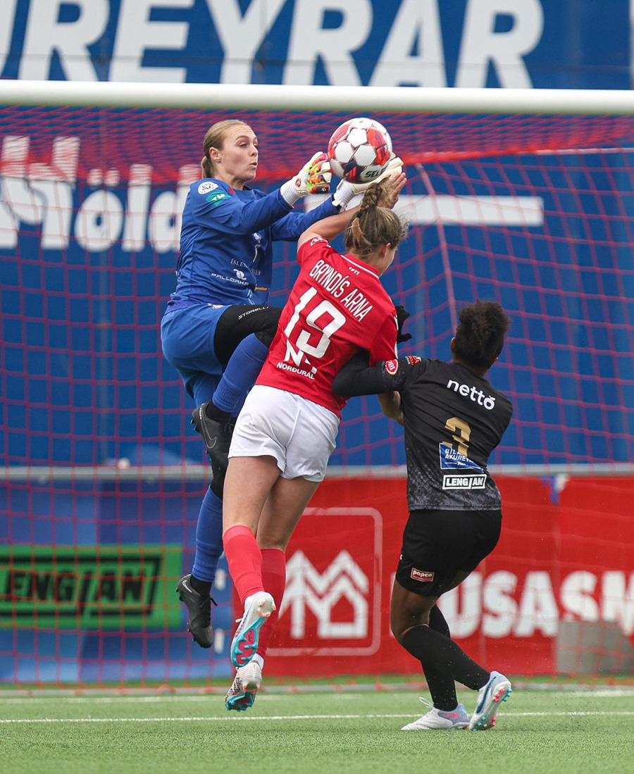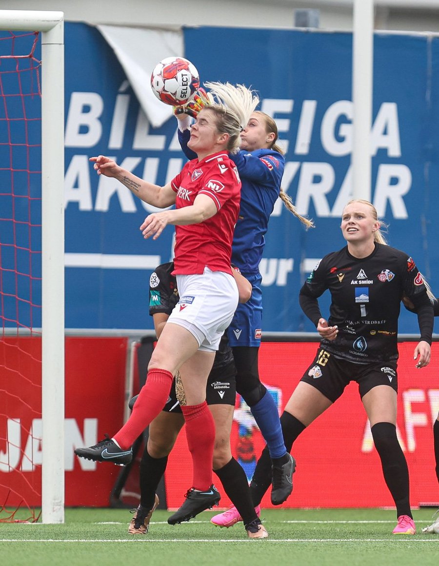 Frábær bolti inn í teig frá Jakobínu en Arna Sif hefur betur gegn Karen Maríu í skallaeinvíginu og kemur boltanum í burtu