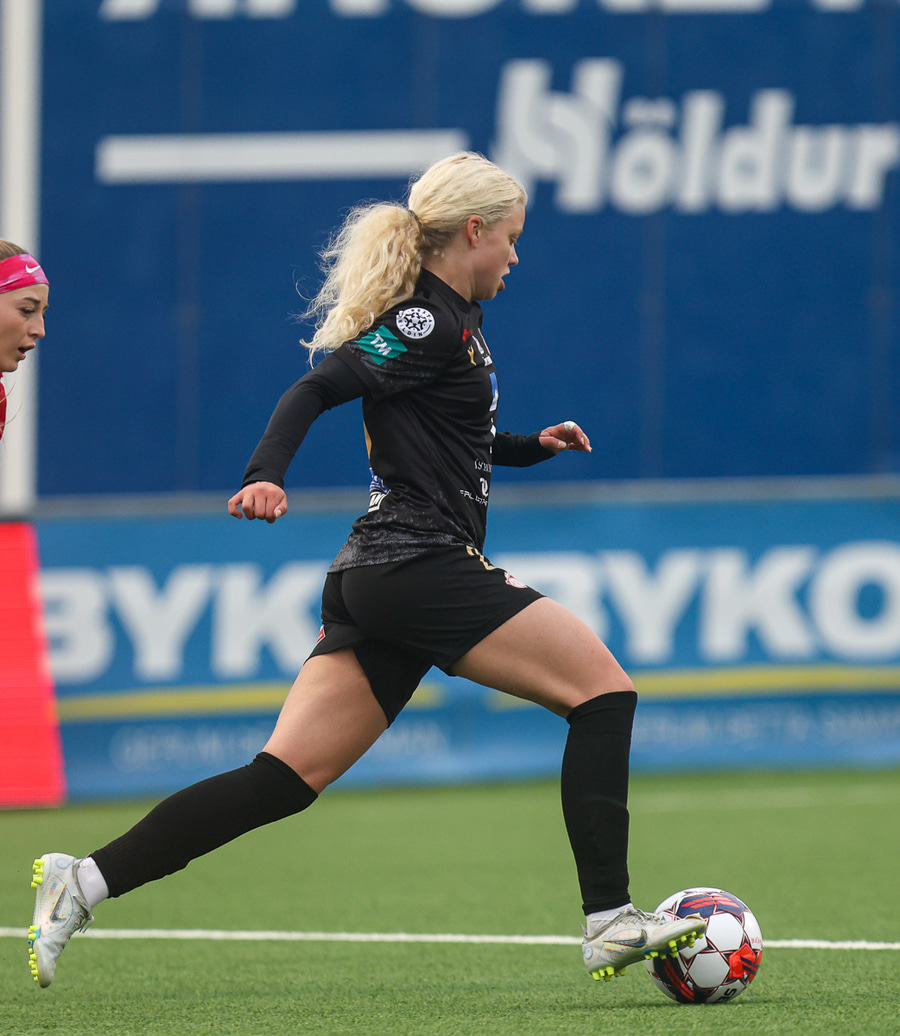Kimberley á fínasta skot fyrir utan teig. Hún skoraði mark af eiginlega nákvæmlega sama stað gegn Þrótti um daginn en í þetta skiptið fór hann fram hjá