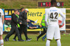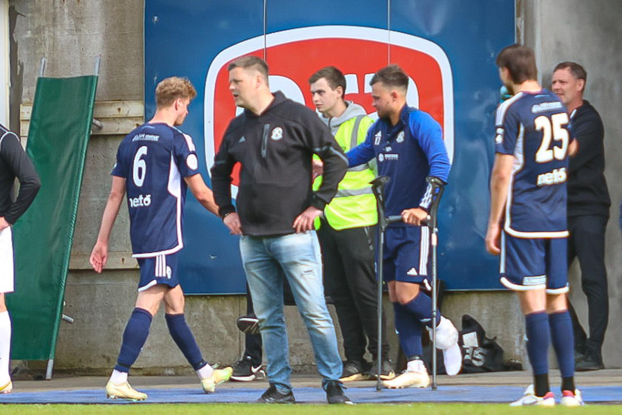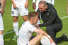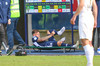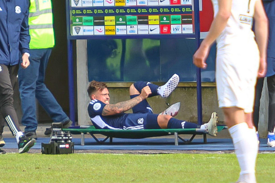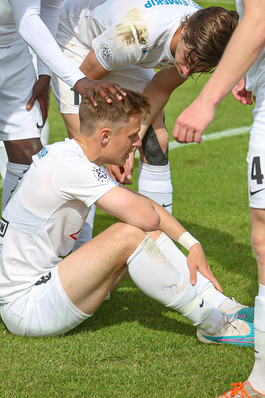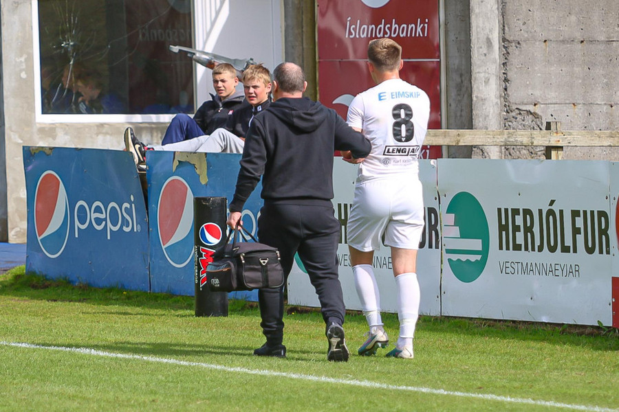 Tómas Bent þarf aðhlynningu. Henn lenti í samstuði fyrr í leiknum en hélt leik áfram. Nú fer hann af velli í bili meðan hugað er að honum.