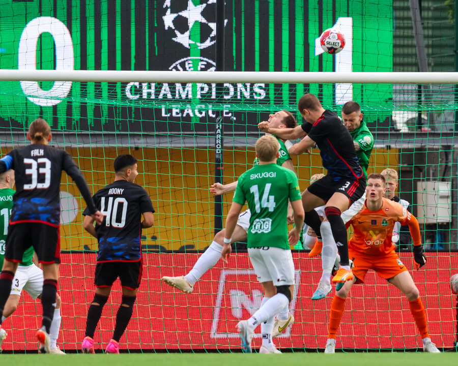 Hætta á mark Blika Elias Jelert hægri bakvörður FCK fær skoppandi bolta á hægri kantinum og á geggjaða fyrirgjöf inn á teig en Goncalves skallar yfir markið