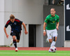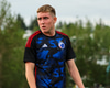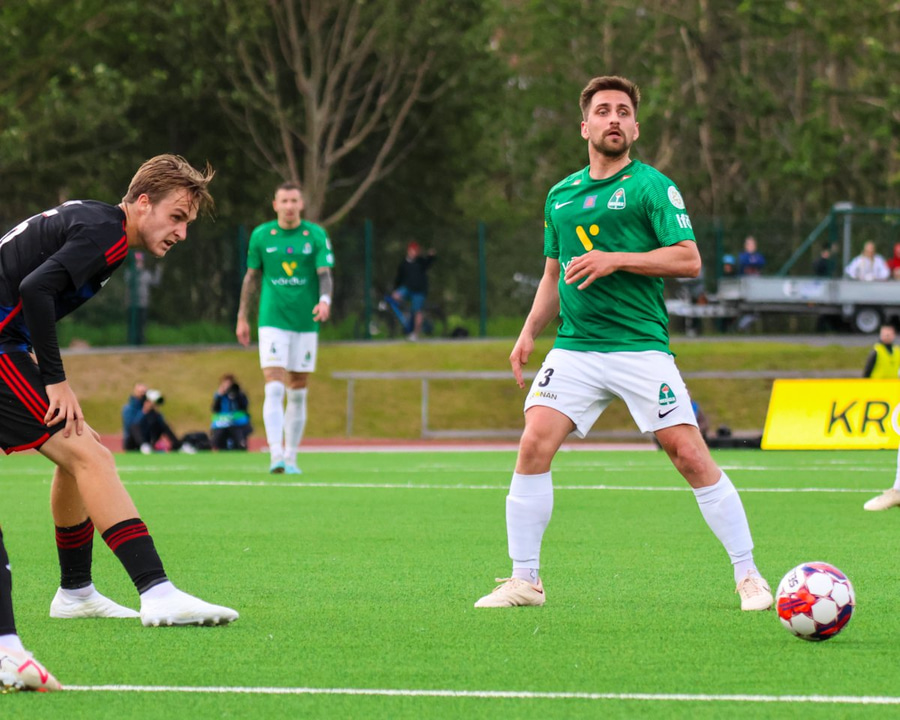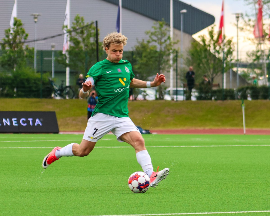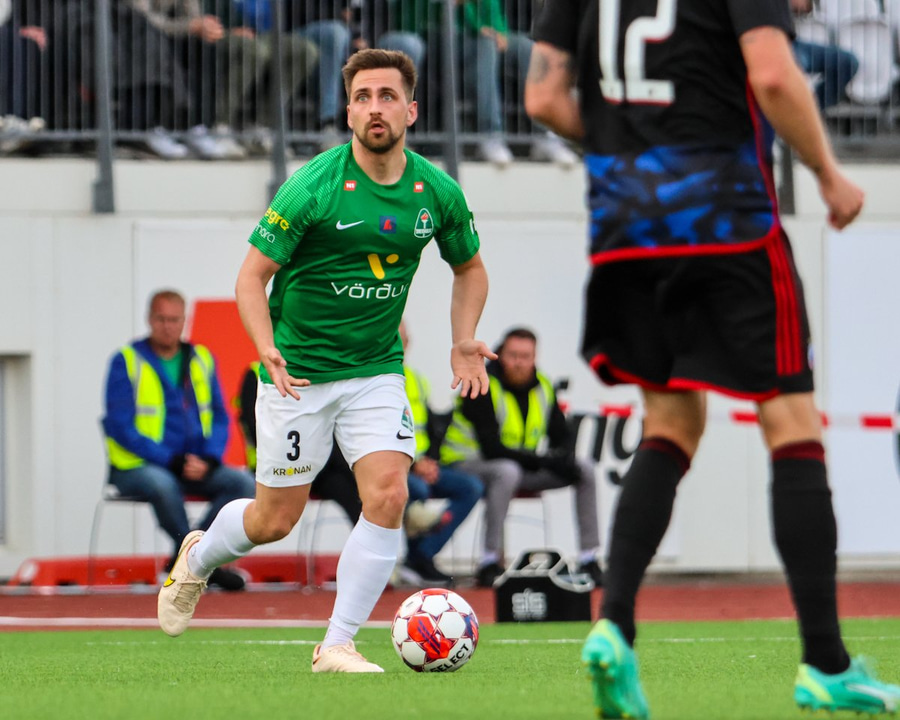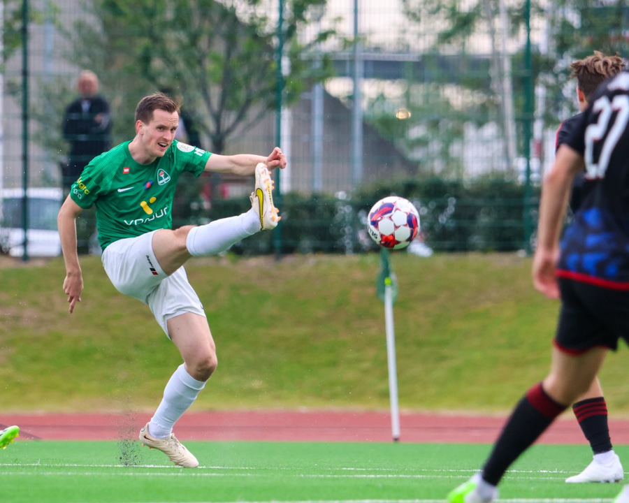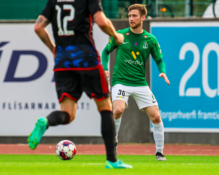 Rasmus Falk keyrir upp að endalínu og reynir fyrirgjöf sem Oliver fer fyrir