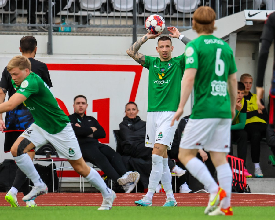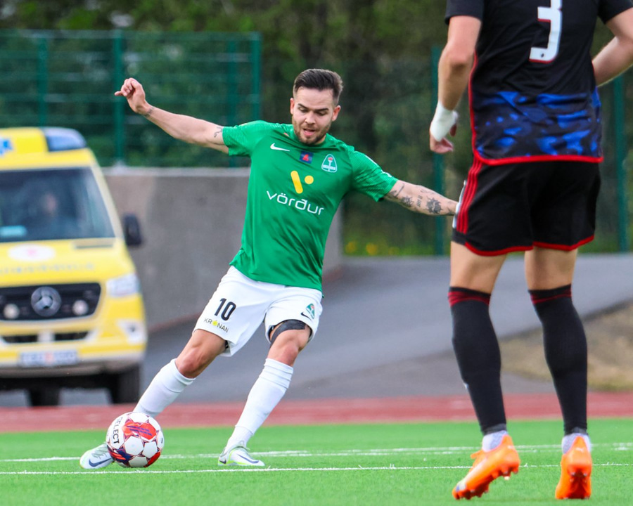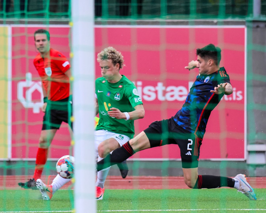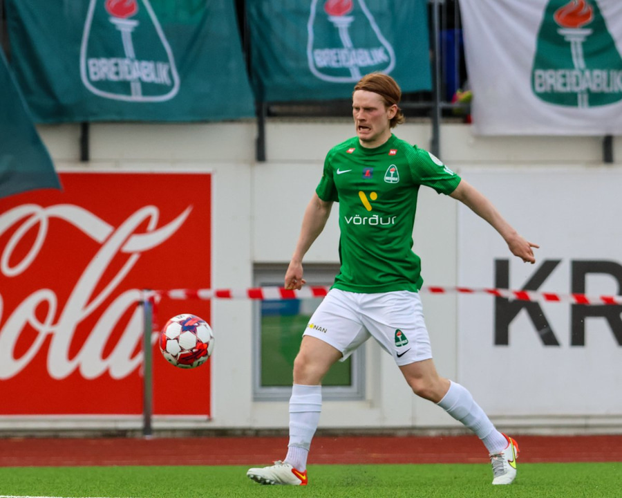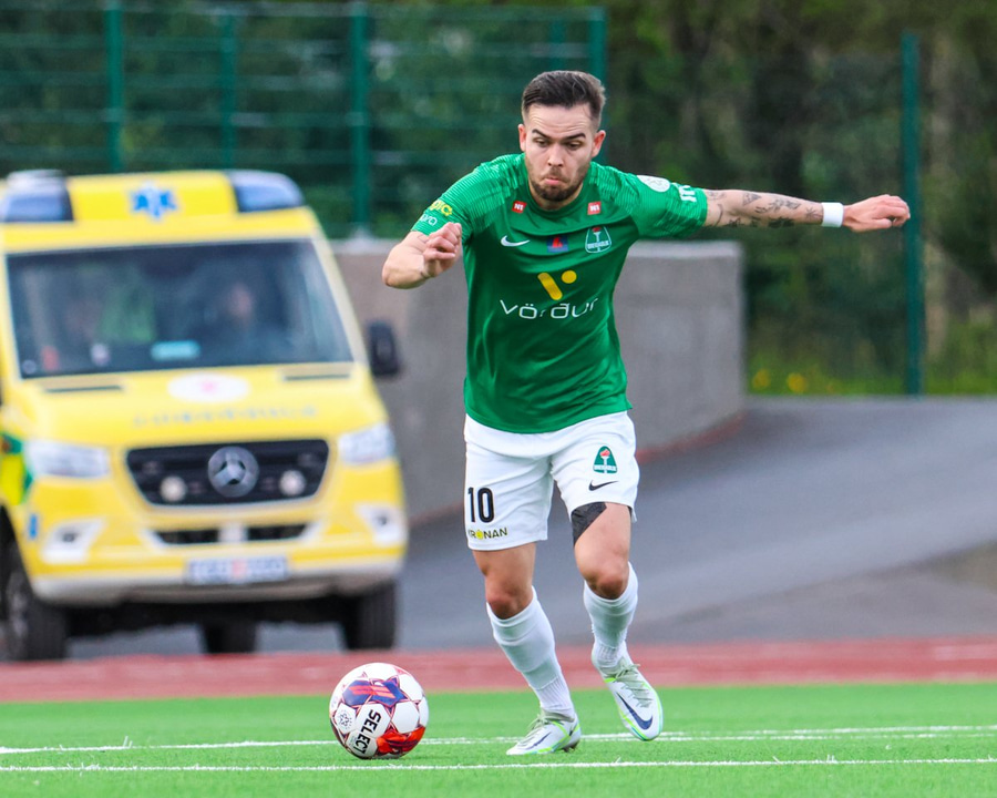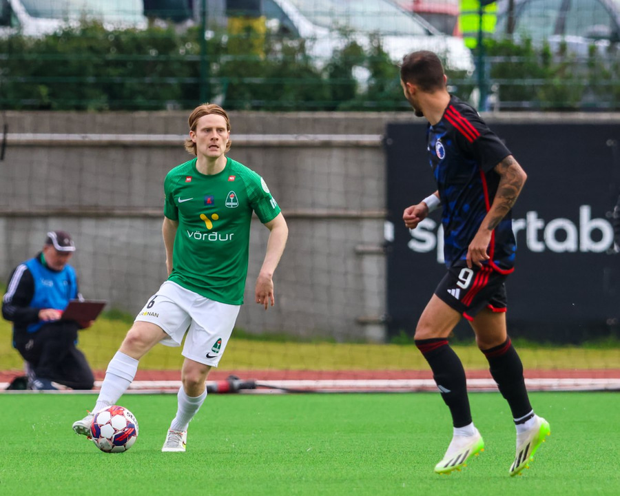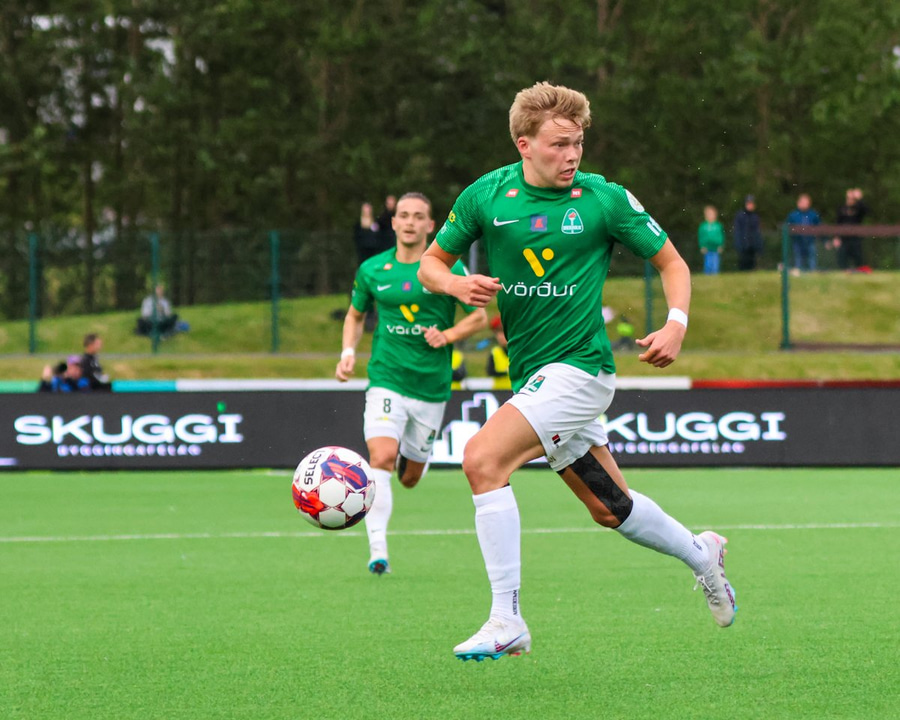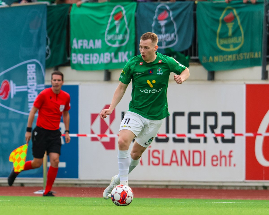 Blikar fá góða stöðu eftir ömurlega sendingu frá V. Lund og Oliver keyrir í átt að teignum en á slaka sendingu ætlaða Jasoni Daða