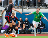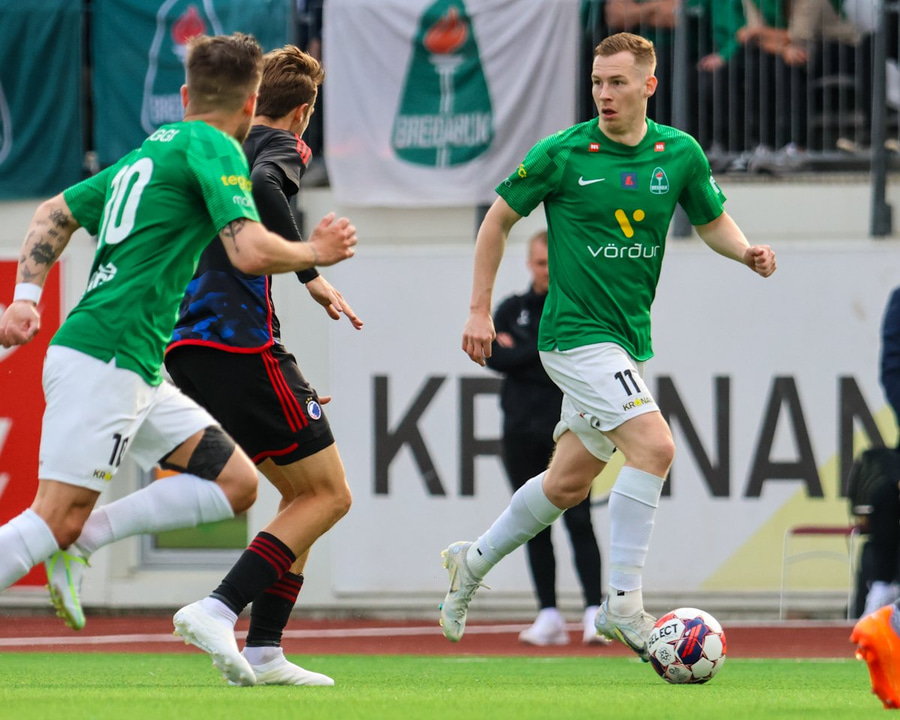 Um að gera! Höskuldur fær boltann á vallarhelmingi FCK, tekur nokkrar snertingar í átt að marki og á fast skot meðfram jörðinni en það er töluvert framhjá markinu