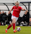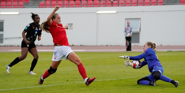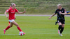 Sandra María meö skot eftir góða skyndisókn heimakvenna. Hittir boltann vel sem því miður fer í slánna og út.