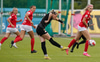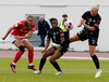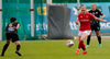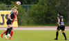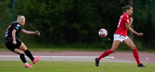 Amanda með stórskemmtilega tilraun eftir klafs í teignum. Setur boltann í háum boga afturfyrir sig. Kemur Melissu úr jafnvægi sem þó nær að slá boltann í slá og yfir.