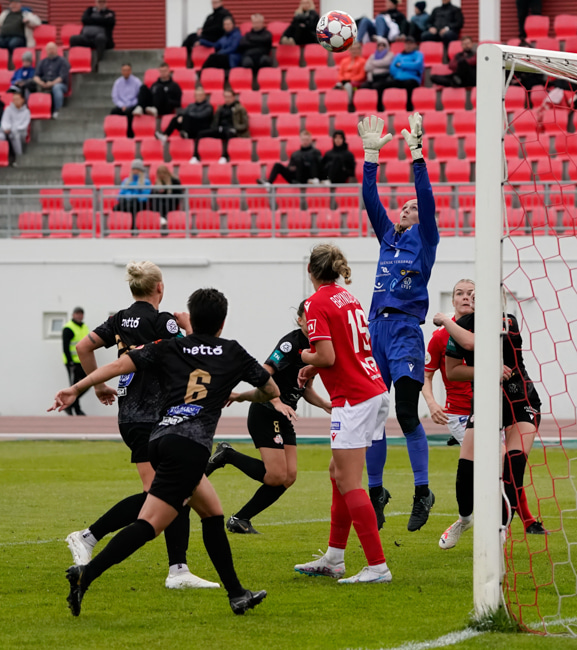 Margrét Árnadóttir reynir skot af löngu færi, Fanney ekki í teljandi vandræðum með það.