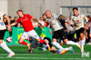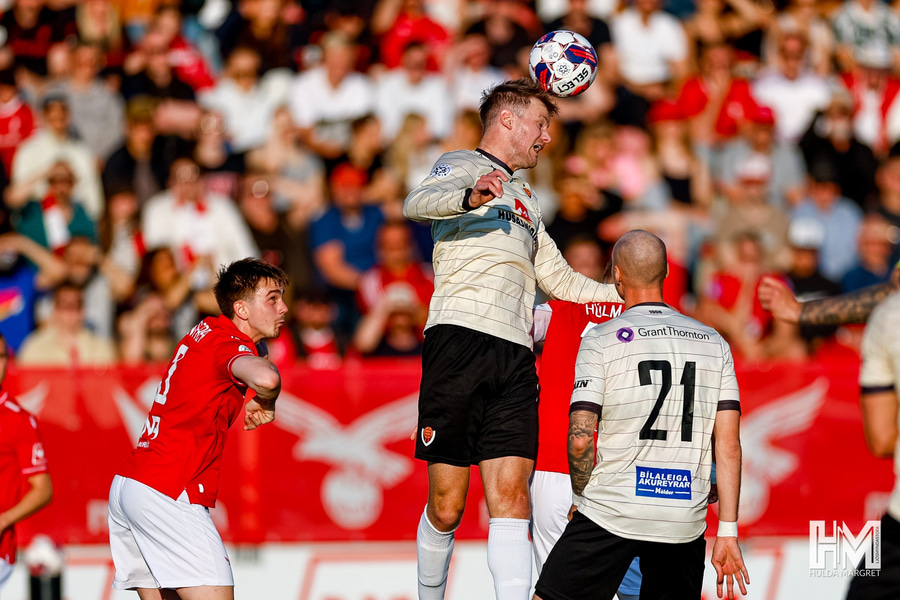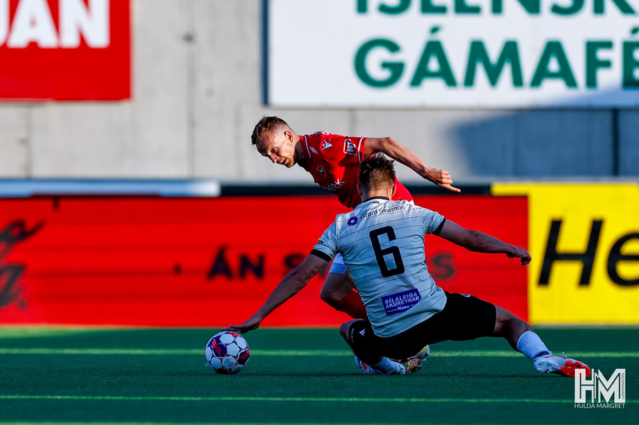 Erling Agnarsson með fyrirgjöf inn í teiginn og boltinn siglir í gegnum allan teiginn og Danijel Djuric kemur á ferðinni og rennir sér í boltann og setur hann í netið.