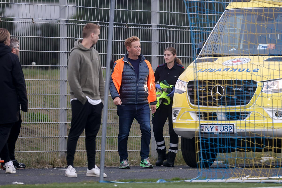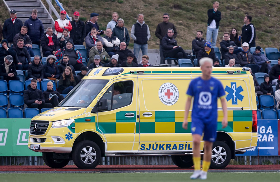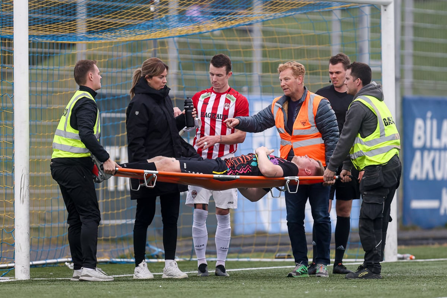 Sveinn Óli stekkur út til að kýla boltann burt og lendir illa á Arnari Þór. Hann liggur eftir og þarf aðhlynningu.