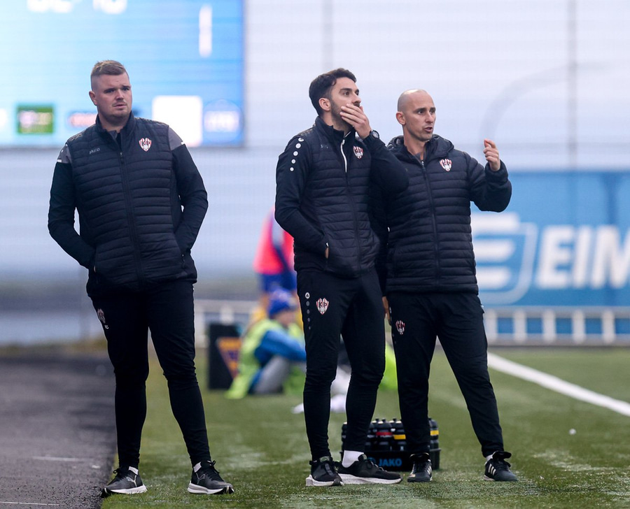 Hinrik fær sendingu í hlaupið og tekur á strik upp vinstri kantinn. Hann setur boltann fyrir og finnur Izaro sem tekur nokkur spor áður en hann hleður í skot sem fer í varnarmann og afturfyrir.
