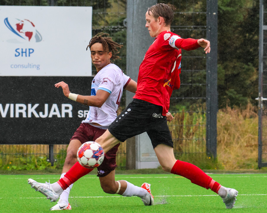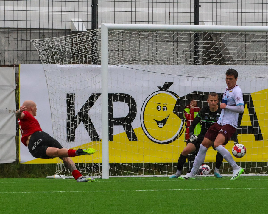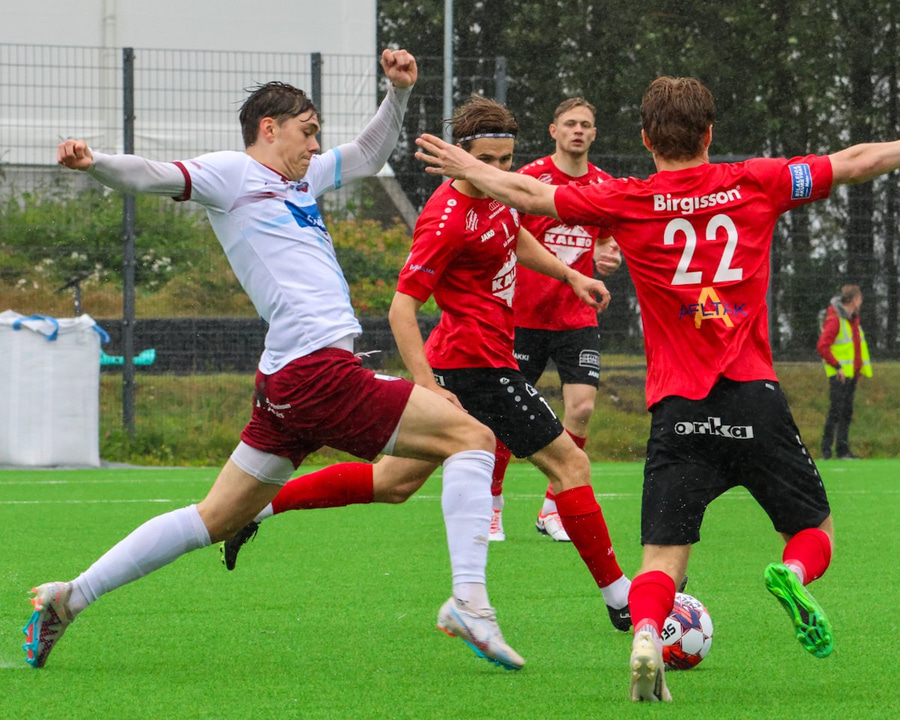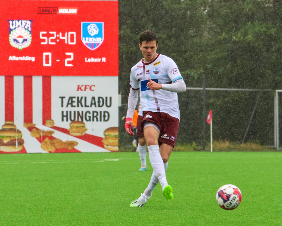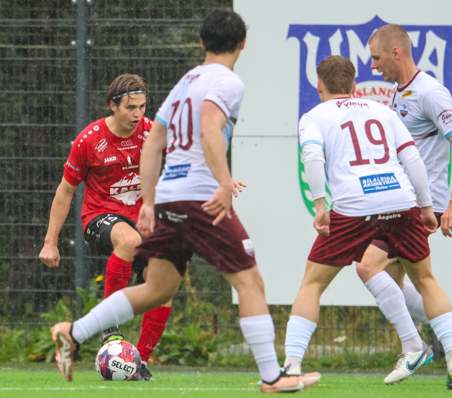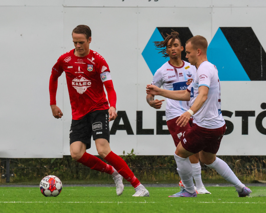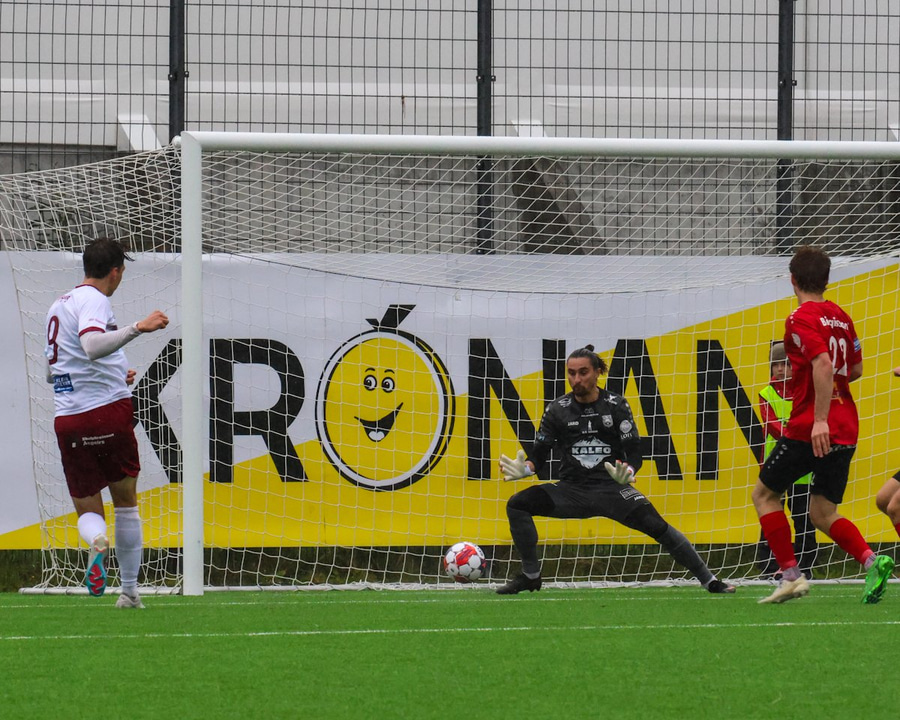 Klaufagangur hjá Gunnari í vörninni og Omar við það að sleppa í gegn. Rasmus nær þó að stinga sér fram fyrir hann og koma boltanum í horn.