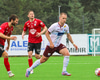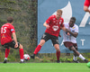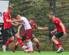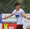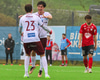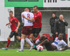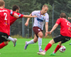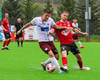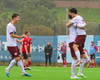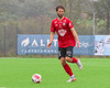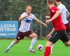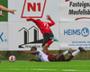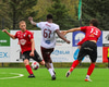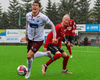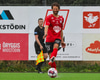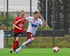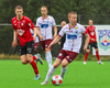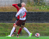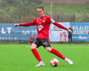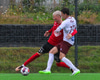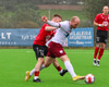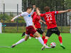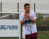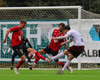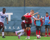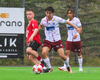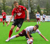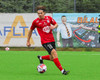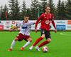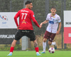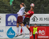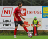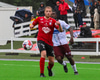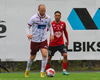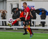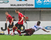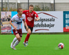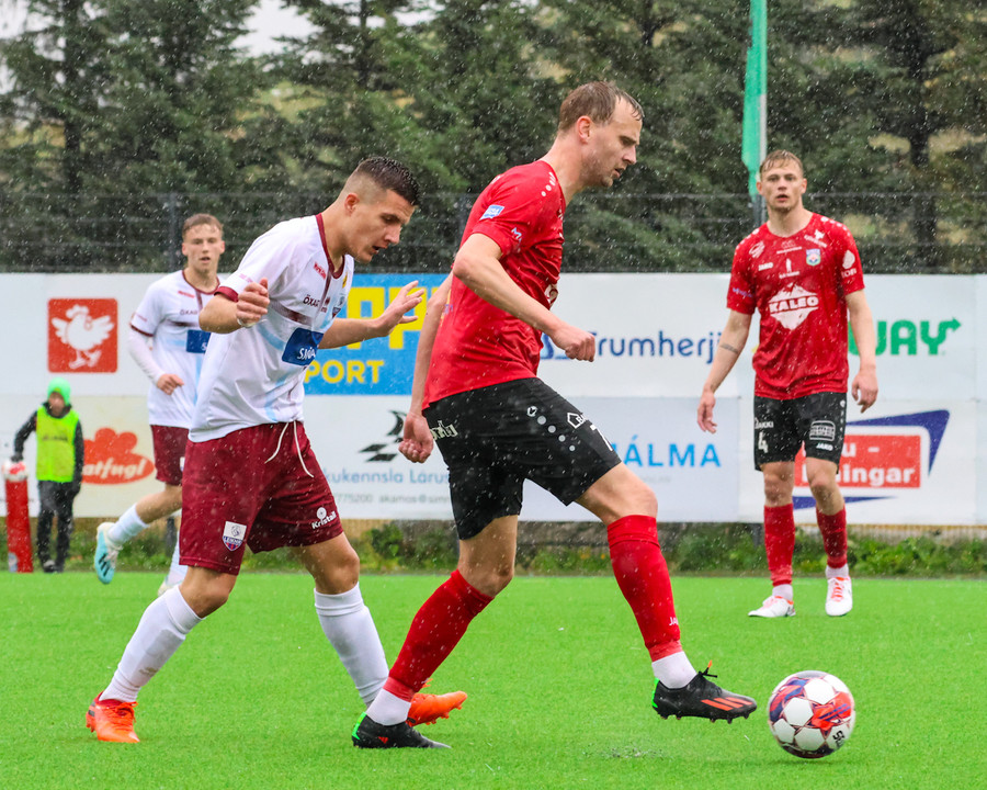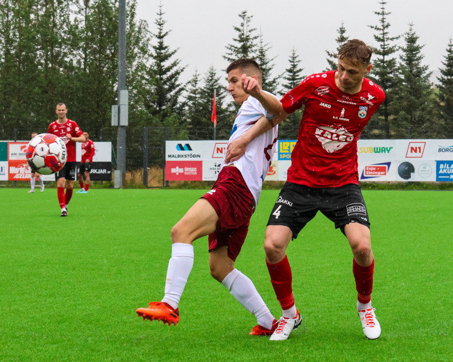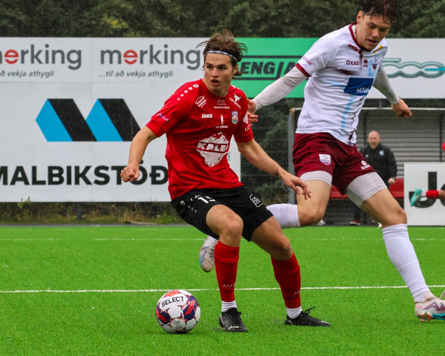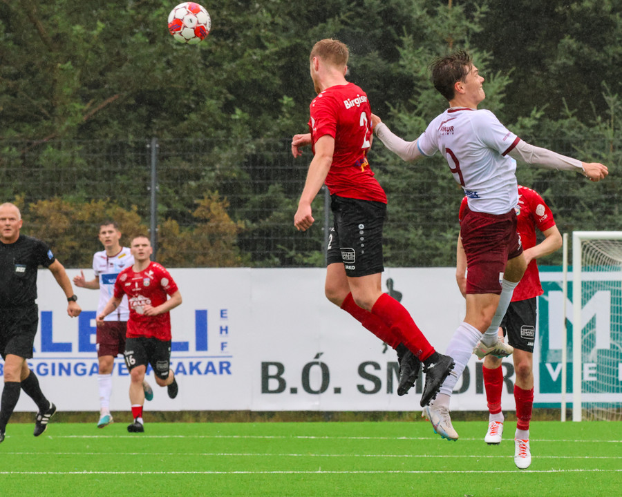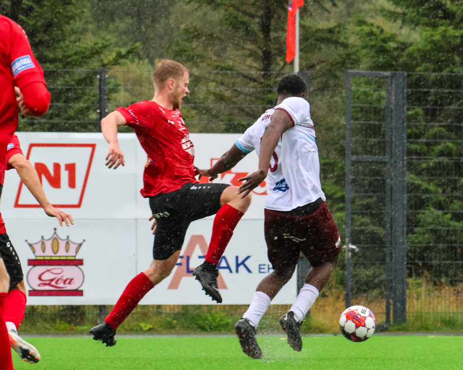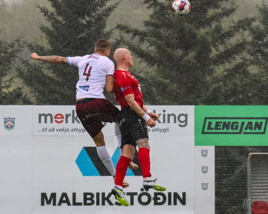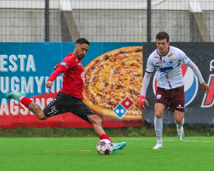 Ivo Braz með utanfótar fyrirgjöf en Andi Hoti stekkur hæst og skallar boltann burt.