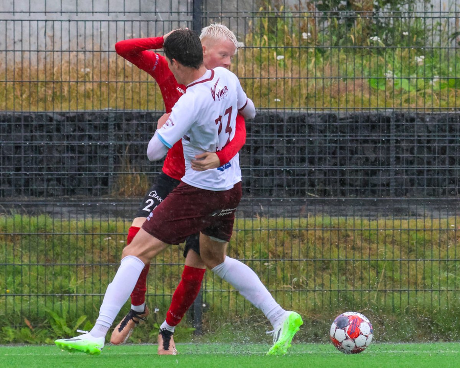 Viktor fær lausan rúllandi bolta til sín en tekst á einhvern ótrúlegan hátt og missir hann frá sér og sparkar í hann liggjandi til að koma honum frá. Boltinn fer beint á Aron Elí sem á skot en Viktor nær að standa á lappir og ver í horn.
