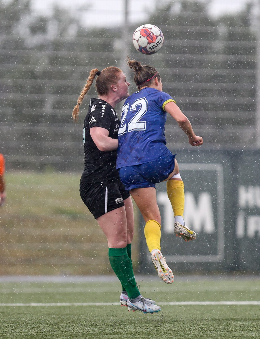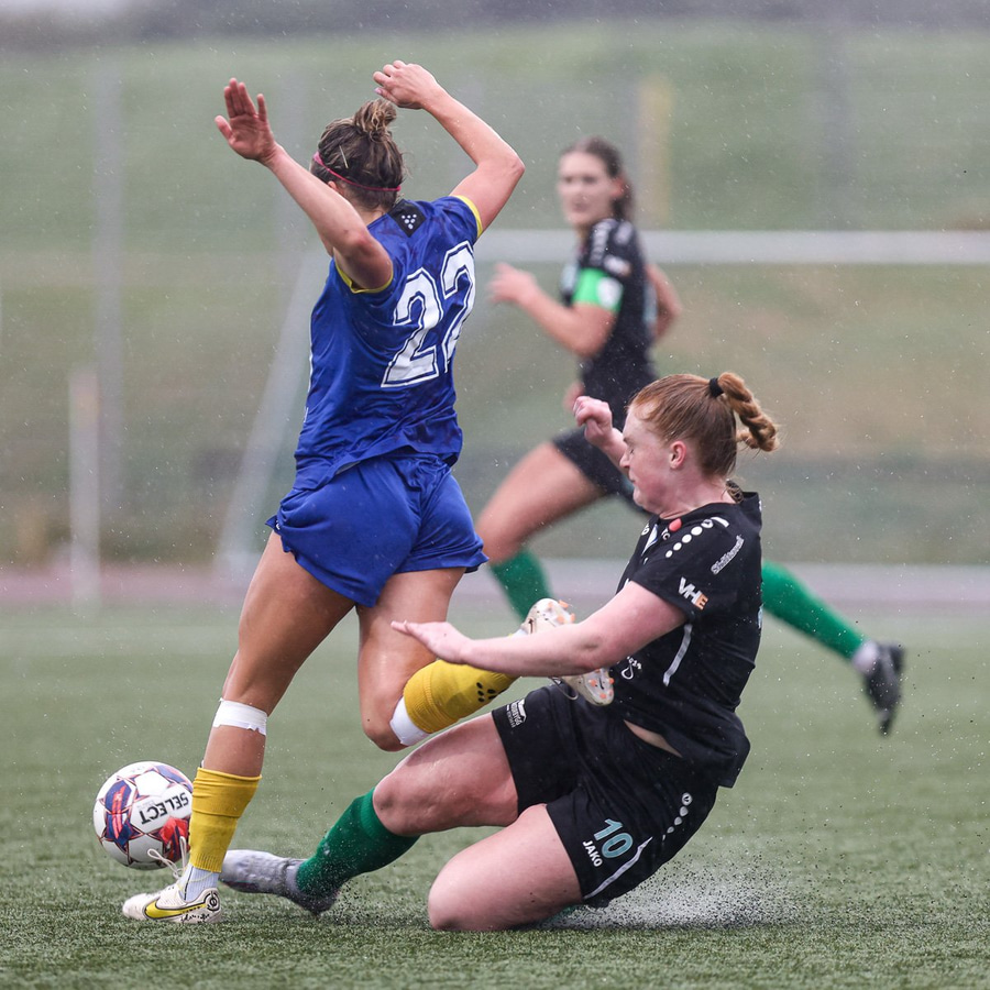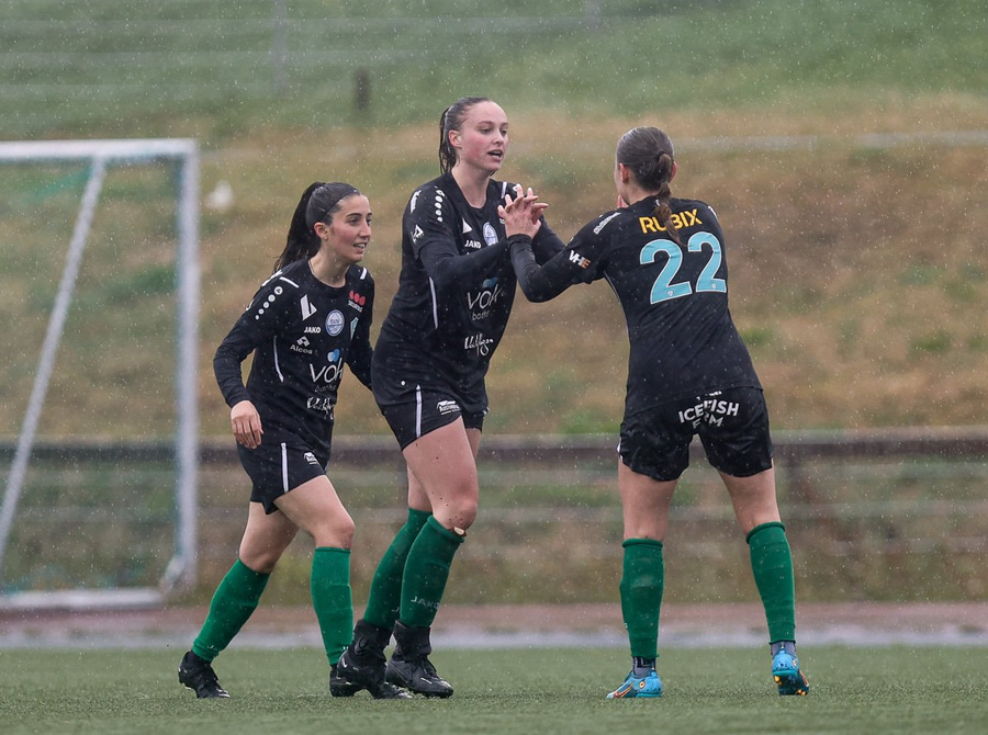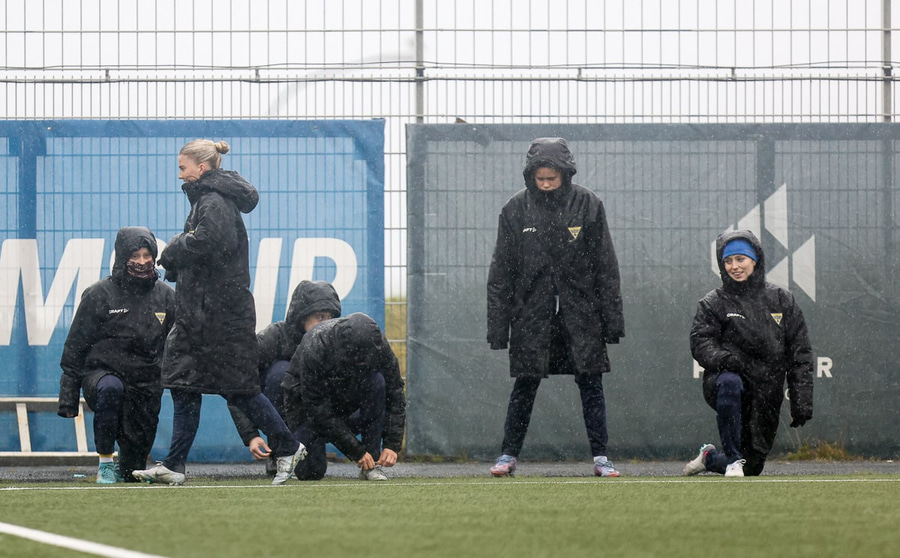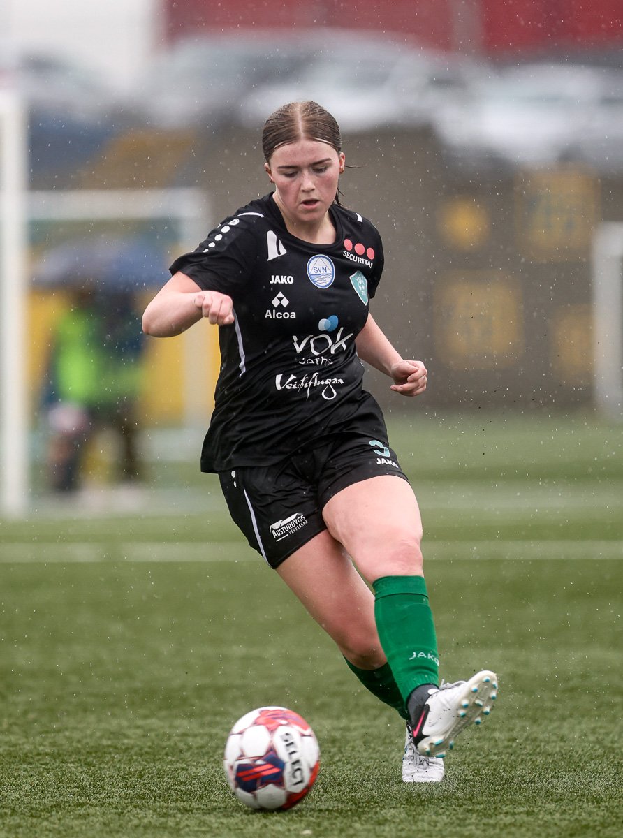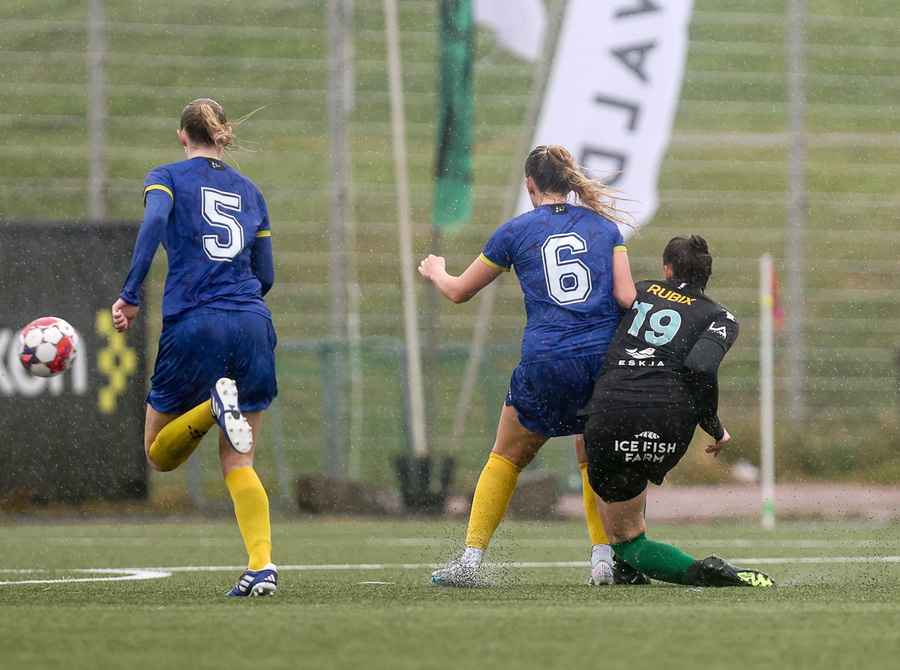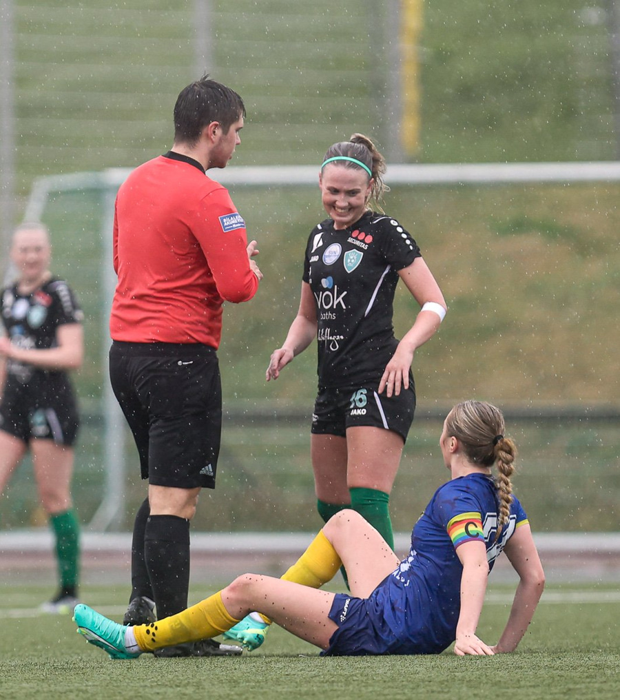 Stórskemmtilegur leikur í grenjandi rigningu. Hannah Abraham fór á kostum og skoraði fjögur mörk!