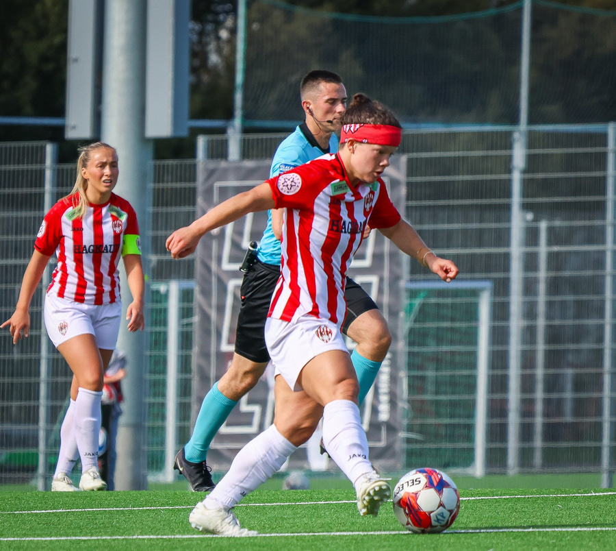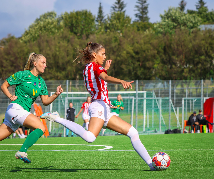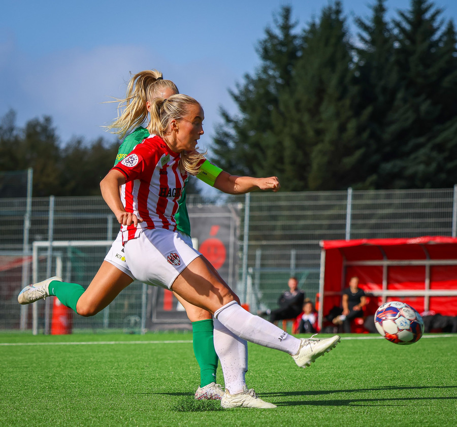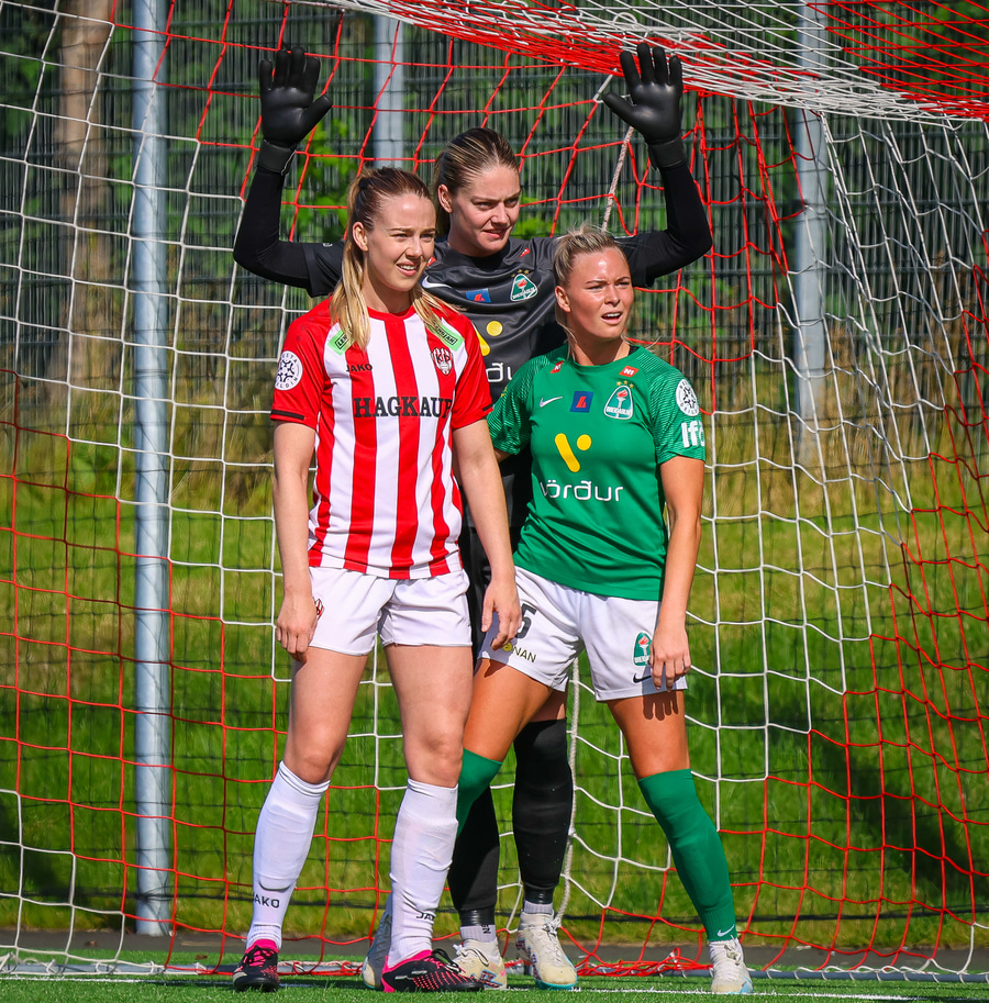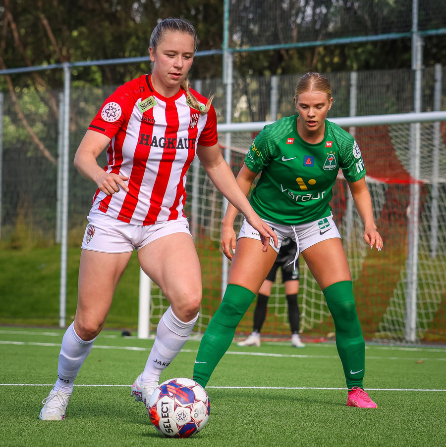 Taylor fær boltan á miðjunni finnur Öglu í labbir sem gerir frábærlega að komast framhjá Mikenna en á skot í varnarmann, Agla afar hættuleg hér í byrjun leiks.