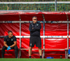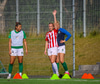 Liðin labba til búningsherbergja. Leikurinn alveg að fara af stað í blíðunni hér á Avis vellinum.