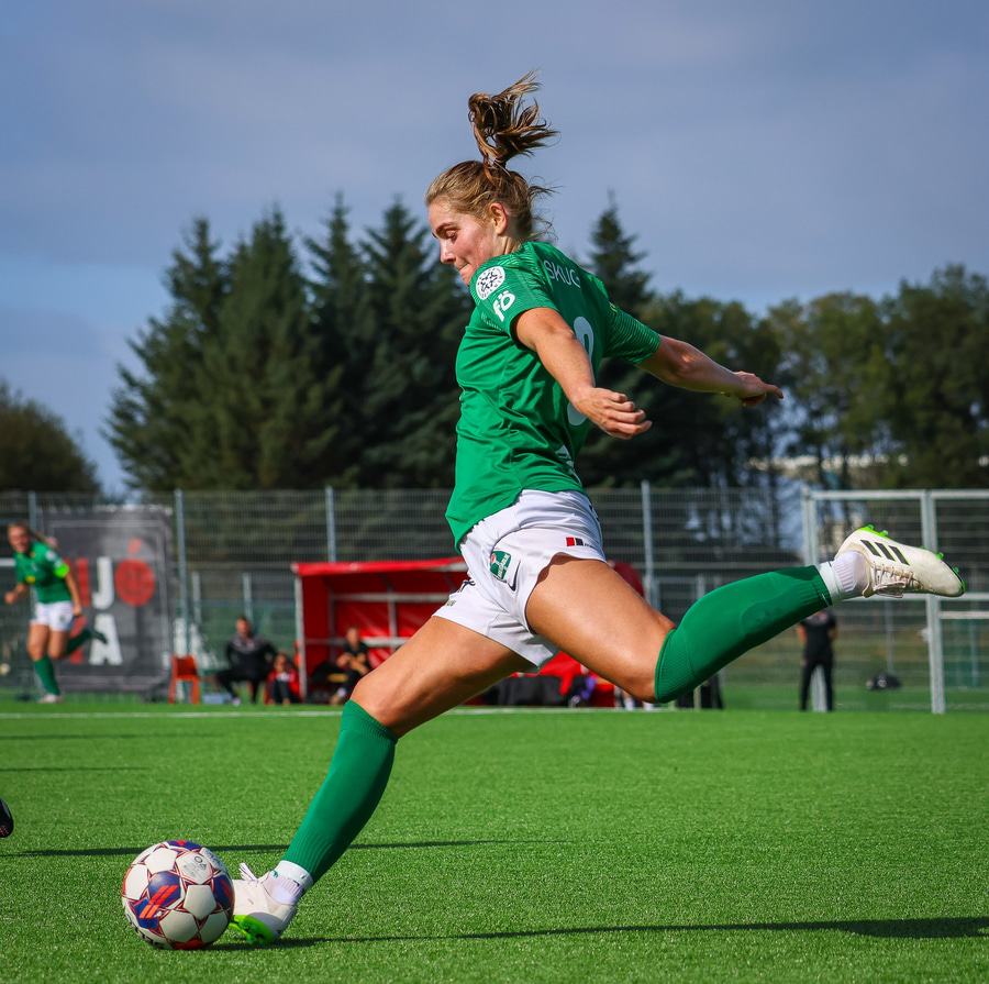 Sæunn tekur spyrnuna og hún er yfir allan pakkann og aftur fyrir.