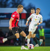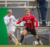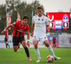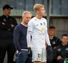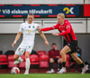 Aron Elís fær sendingu frá Nikolaj og er einn gegn Brynjari Atla en skotið yfir markið.