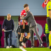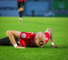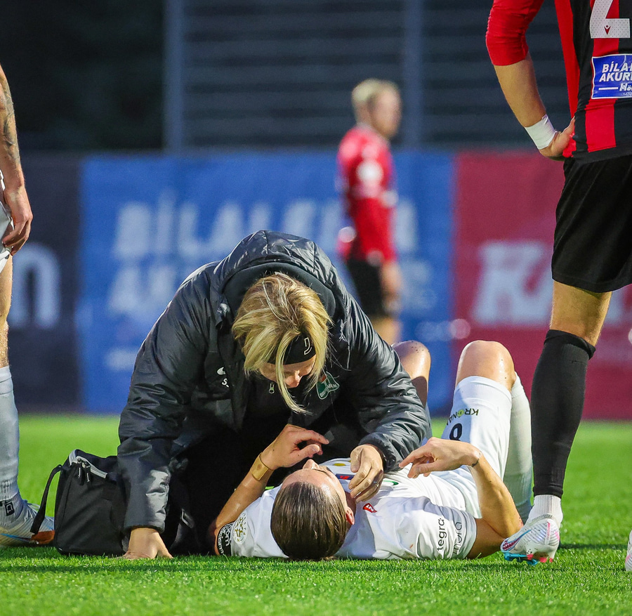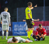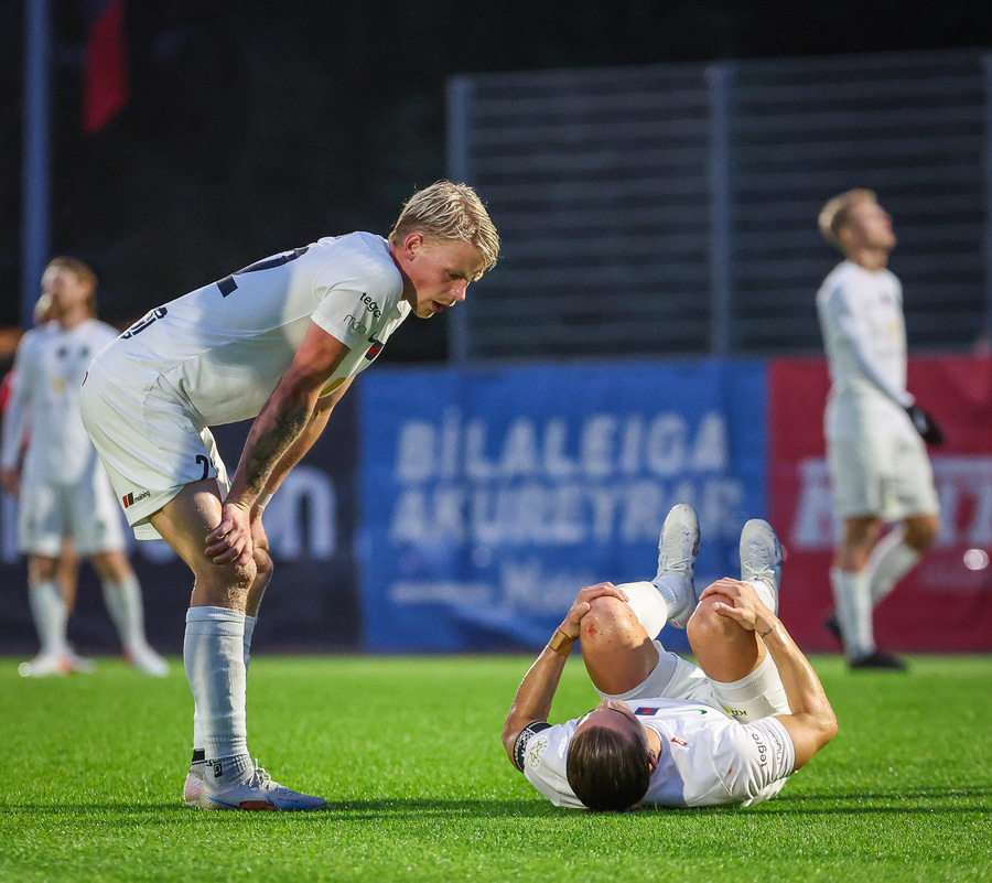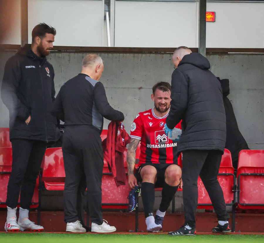 Í annað sinn í leiknum. Virðist vera meiddur á ökkla. Sýnist Helgi Guðjóns vera að koma inn á fyrir hann.